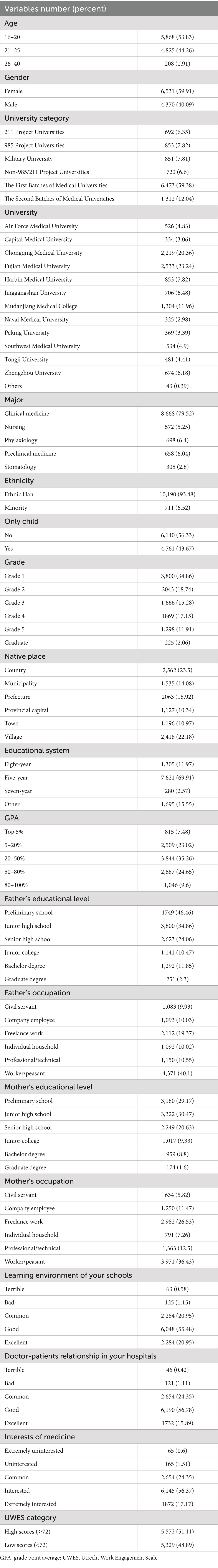 A total of 11,265 target students submitted the questionnaire and completed the UWES (Supplementary Table S1), but only 10,901 responses were filtered and included in the further analysis (Figure 1). Their general information is listed in a Table 1 and visualized as heatmaps (Figure 2), along with their answers.