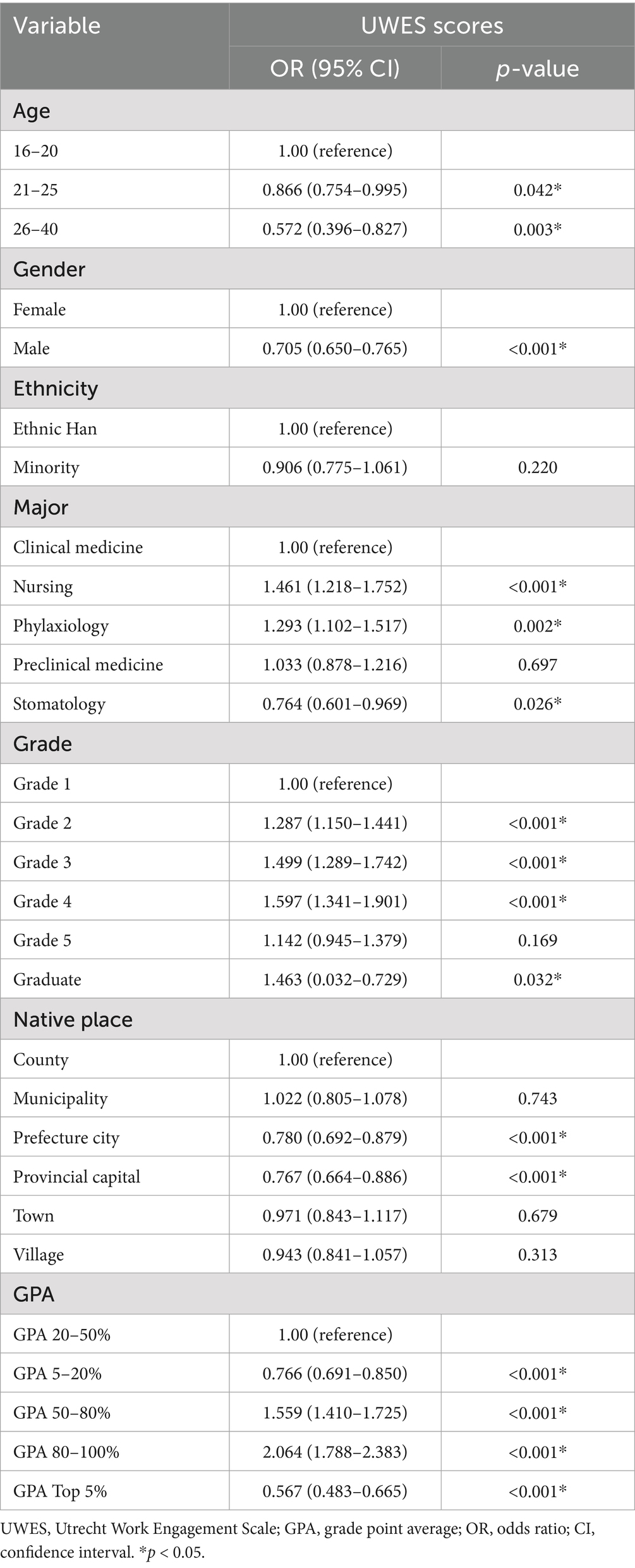 In the univariate analysis, the correlation between GPA and the UWES was preliminarily explored. Considering the comprehensive influence of multiple variables on the UWES, we also performed a multivariate logistic regression analysis to estimate whether GPA is a significant factor in the UWES. Variables including age, gender, ethnicity, major, grade, native place, and, most importantly, GPA were taken into consideration. For each variable, the odds ratio (OR) was calculated to evaluate the influence on the UWES. Therefore, sets of ORs, coupled with a corresponding 95% confidence interval (95% CI) and p-values, are listed in a table.