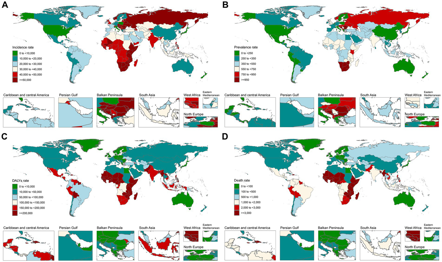 | Regions | Incidence rate | Prevalence rate | DALYs rate | Death rate | ||||||||