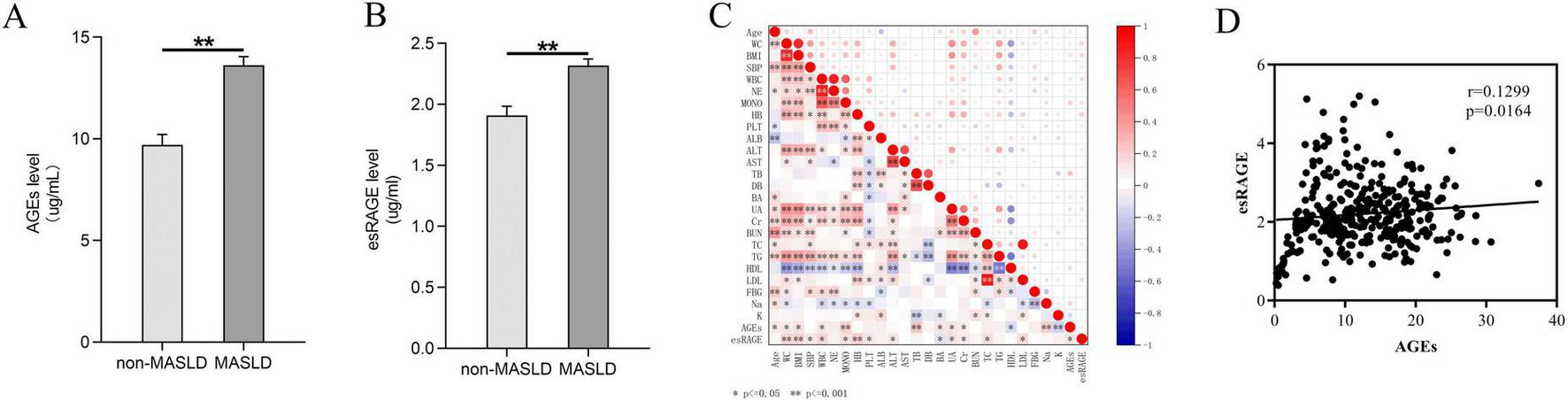 Comparative analysis of AGEs and esRAGE levels in normal controls versus patients with MASLD. (A) Patients with MASLD had considerably higher levels of AGEs (P < 0.001). (B) MASLD patients had considerably higher levels of esRAGE (P < 0.001). (C) A heatmap depicting the correlation analysis among all candidate predictors showed statistical significance, indicated by asterisks (*) and double asterisks (**), in the correlations between variables. (D) Scatterplot of AGEs versus esRAGE, with a positive correlation (P = 0.0164).