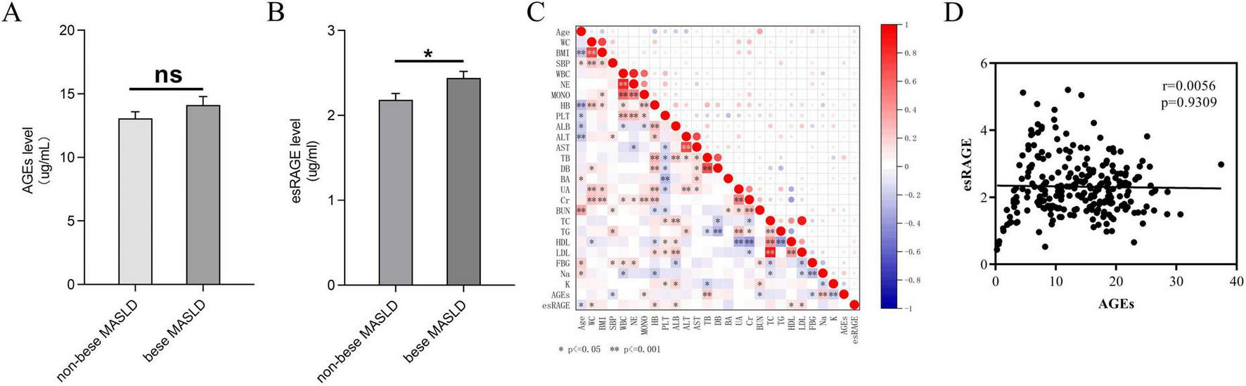 AGEs and esRAGE levels in obese and non-obese MASLD patients are compared. (A) No substantial variations in AGE levels were seen between non-obese and obese MASLD patients. (B) Patients with MASLD who were obese had elevated levels of esRAGE (P < 0.05). (C) A heatmap depicting the correlation analysis among all candidate predictors showed statistical significance, indicated by asterisks (*) and double asterisks (**), in the correlations between variables. (D) AGEs and esRAGE did not show a statistically significant link, according to Spearman’s correlation analysis.
