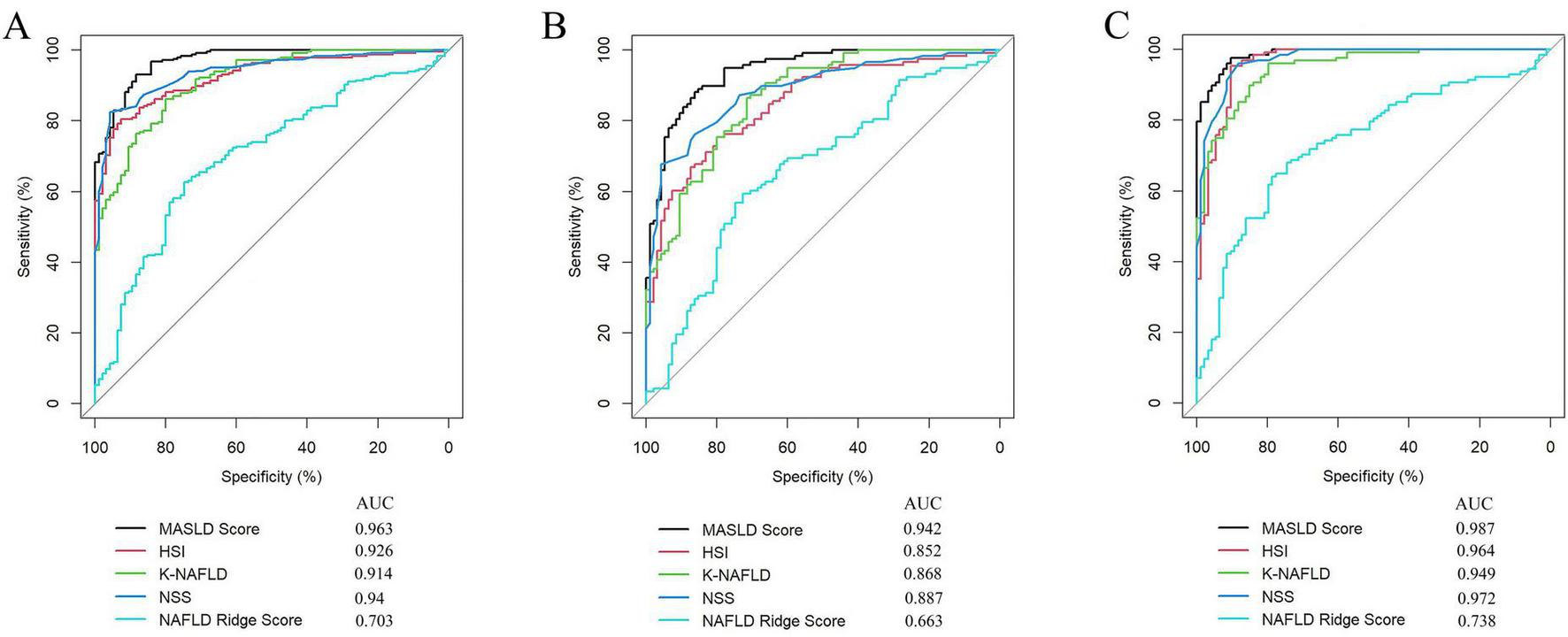 The predictors selected through the Lasso method for clinical modeling were first subjected to univariate logistic regression analysis to identify clinically significant variables. Construction of the final model using multiple logistic regression analysis. The area under the receiver operating characteristic (ROC) curve (AUC) was used to measure performance. With the help of the “caret” R package, internal validation was carried out using the 1,000-iteration Bootstrap resampling approach. ROC curves were constructed with the help of the “pROC” R package, and a nomogram was made with the help of the “rms” R package. The “rms” and “ResourceSelection” R packages were used to plot calibration curves. The “rmda” R packages was used to perform decision curve analysis (DCA), which evaluated the diagnostic model’s clinical usefulness. Common MASLD indices, including his (30), Korea National Health and Nutrition Examination Survey-derived nonalcoholic fatty liver disease score (K-NAFLD) (31), the NAFL Screening Score (NSS) (32), and the NAFLD Ridge Score (33), were calculated according to the methods described in the original publications.