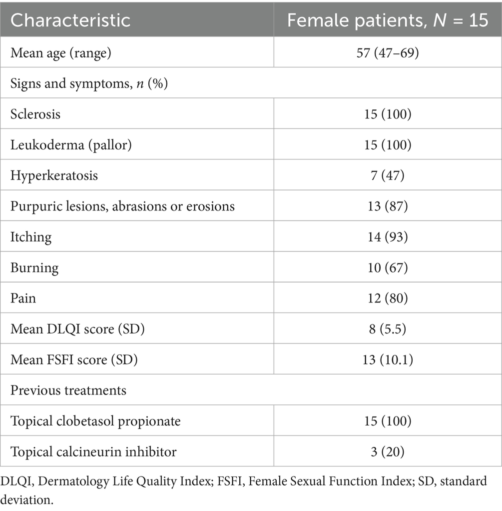 A total of 15 female patients with vulvar atrophy and lichen sclerosus were enrolled and received treatment; all 15 patients were available for assessment at each post-treatment assessment. Mean patient age was 57 and most patients had disease symptoms at baseline, which included sclerosis, leukoderma (pallor), hyperkeratosis, purpuric lesions and abrasions or erosions, itching, burning and pain. A detailed description of baseline demographic and clinical characteristics is presented in Table 1. No complications or side effects were reported in the study.