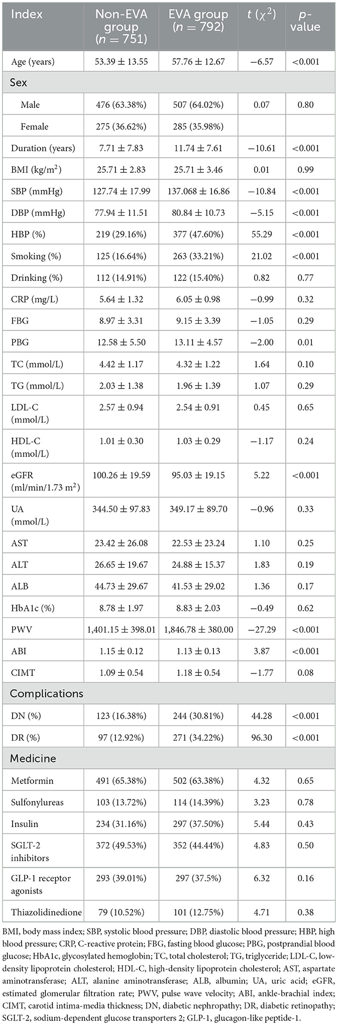 Methods: We retrospectively analyzed data from 1,543 patients with T2DM. The patients were divided into non-EVA and EVA groups based on ankle-brachial pulse wave velocity (PWV).