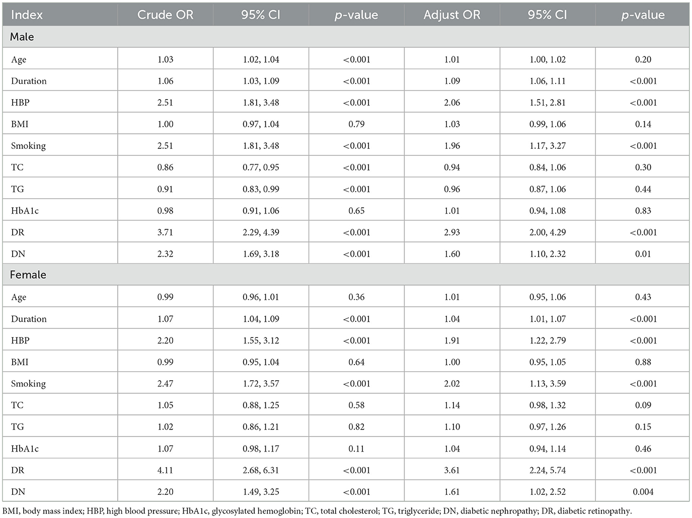 Multivariate logistic regression analysis was performed with EVA as the dependent variable and baseline characteristics (age, duration, BMI, HBP, smoking, HbA1c, TC, TG, DN, and DR) as independent variables. The risk factors for EVA in male included: longer diabetic duration (OR = 1.09 95 CI% 1.06–1.11), HBP (OR = 2.06, 95 CI% 1.51–2.81), smoking (OR = 1.96 95 CI% 1.17–3.27), DN (OR = 1.60 95 CI% 1.10–2.32), and DR (OR = 2.93 95 CI% 2.00–4.29).