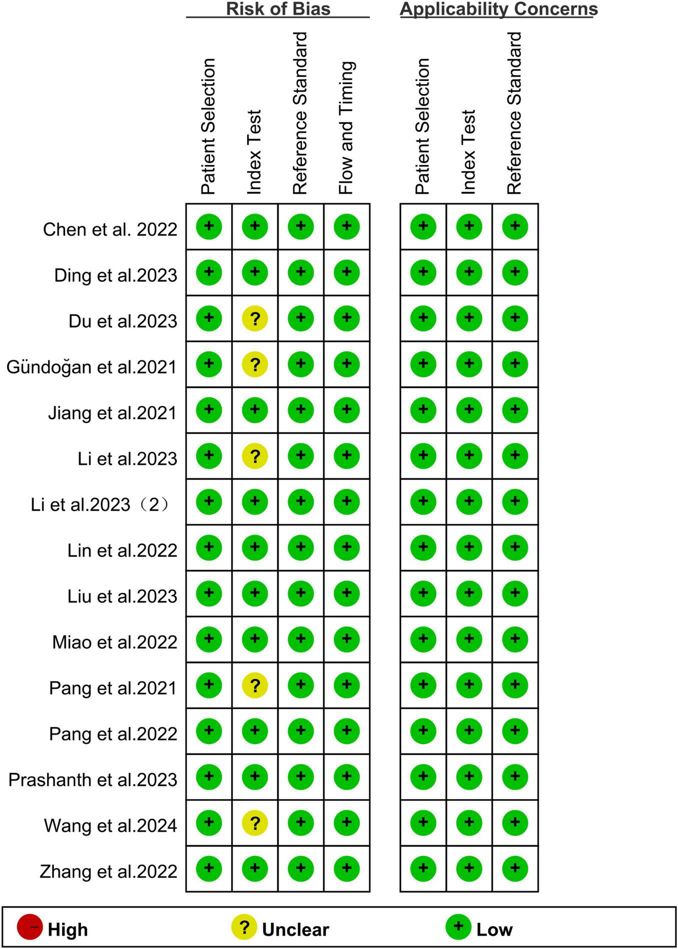 The risk of bias for all studies was evaluated using the QUADAS-2 tool, as illustrated in Figure 2. Regarding the index test, 5 studies (33.33%) were classified as “unclear” due to insufficient information on the use of predefined thresholds. For other aspects, including patient selection, reference standard, flow and timing, and applicability concerns related to patient selection, the index test, and the reference standard, all studies were rated as “low” risk. Overall, no significant quality issues were identified in the included studies.