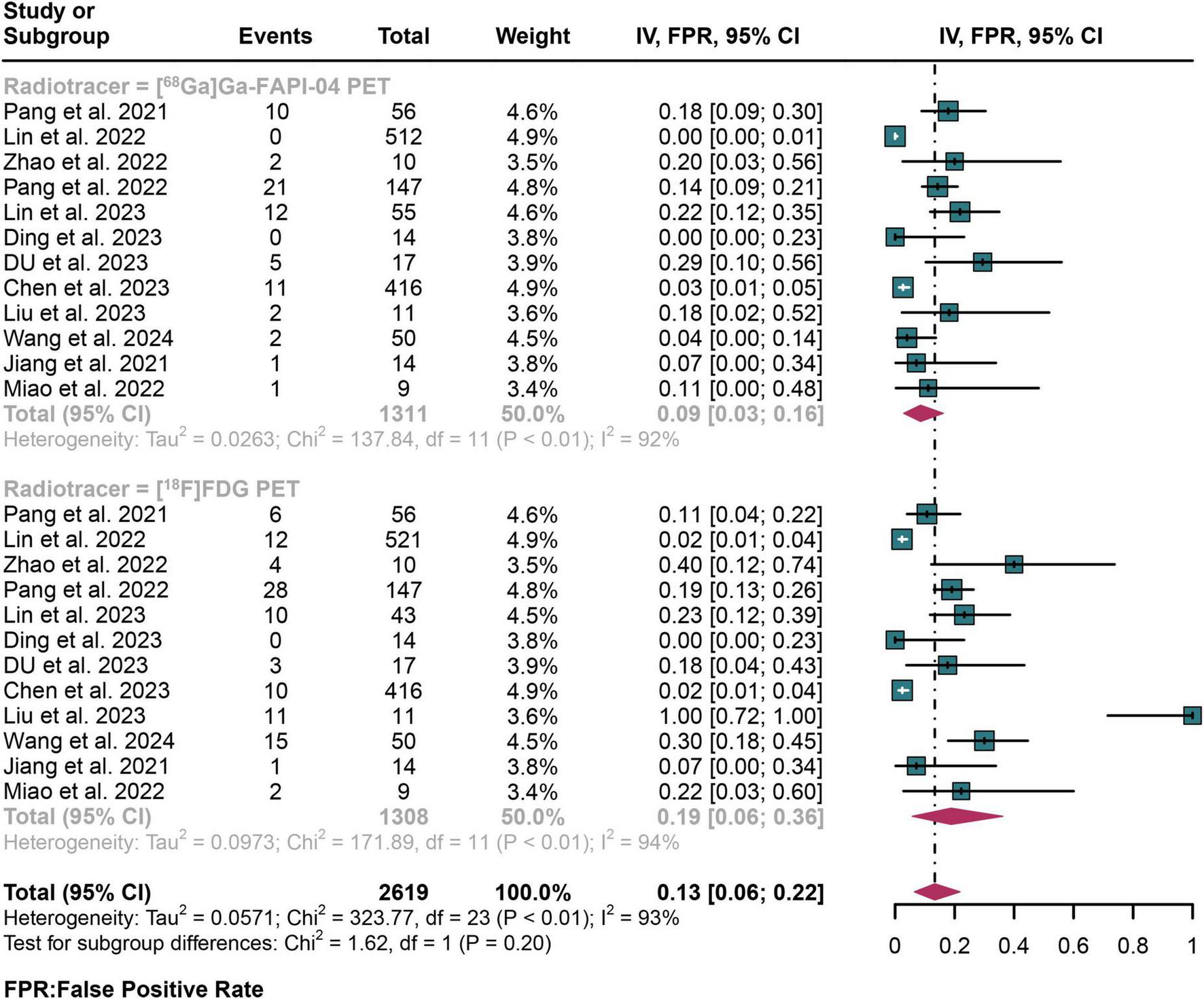 The relative sensitivity of [68Ga]Ga-FAPI-04 PET compared to [18F]FDG PET in diagnosing lymph node metastasis in digestive system cancers is currently under debate, given the conflicting findings in the literature. The study by Lin et al. indicates that the diagnostic performance of [68Ga]Ga FAPI-04 PET is comparable to [18F]FDG PET for lymph node metastasis in digestive system cancers (23); however, Gündoğan et al. found that [68Ga]Ga FAPI-04 PET has higher sensitivity than [18F]FDG PET (24). Therefore, we conducted a systematic review and meta-analysis, rigorously collecting and analyzing all head-to-head eligible studies to provide a more conclusive assessment.
