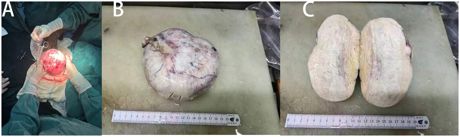 Intraoperative images of the patient’s lesions. (A) Image of ovarian tumor before removal. (B) Gross image after the removal of ovarian tumor. (C) Ovarian tumor profile.