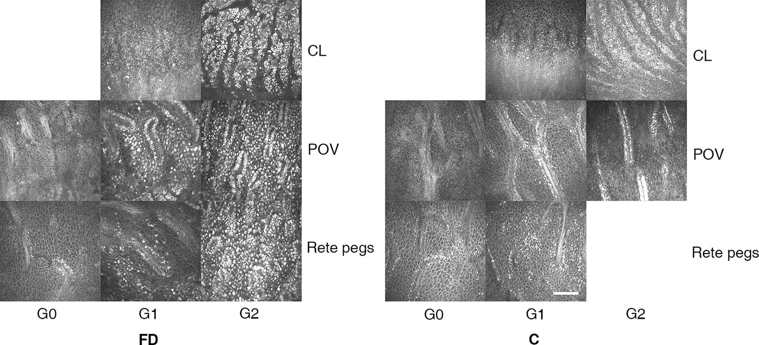 The grading system of hyperreflective cells in CL and in rete pegs: Grade 0: no hyperreflective cells; Grade 1: moderate hyperreflective cells in the basal epithelial cells, intensity of 0–50%; Grade 2: numerous hyperreflective cells in the basal epithelial cells, intensity of >50%.