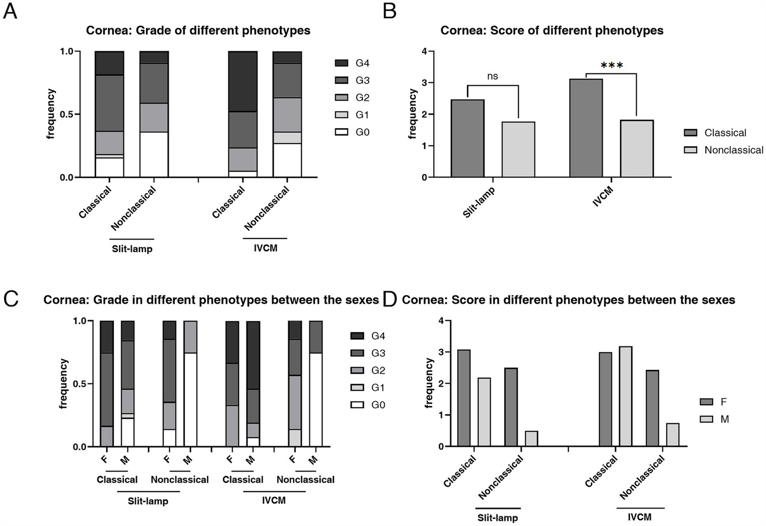 The prevalence of corneal epithelial deposits was higher in the classical phenotype than in the non-classical phenotype (94.74% vs. 72.73%, p = 0.023) (Table 2). The mean score of corneal epithelial deposits grade in the classical phenotype was significantly higher than that in the non-classical phenotype (3.13 ± 1.07 vs. 1.82 ± 1.37, p < 0.001) (Table 2; Figure 5). The composition ratio of epithelial deposits grades was significantly different between phenotypes (p = 0.002), with Grade 4 taking the largest proportion (47.37%) in the classical group, while Grade 3 (27.27%) and Grade 2 (27.27%) in the non-classical group (Table 2).
