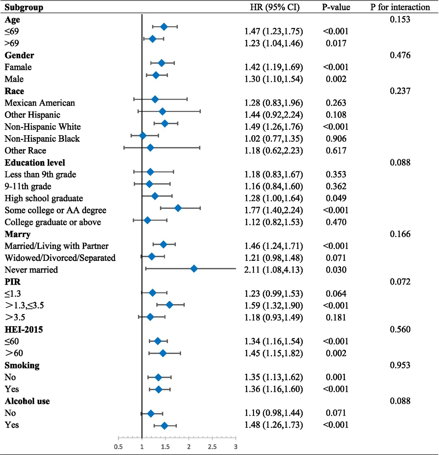 | Continuous | 1.63 (1.40, 1.91) | 1.56 (1.34, 1.81) | 1.49 (1.26, 1.77) |
