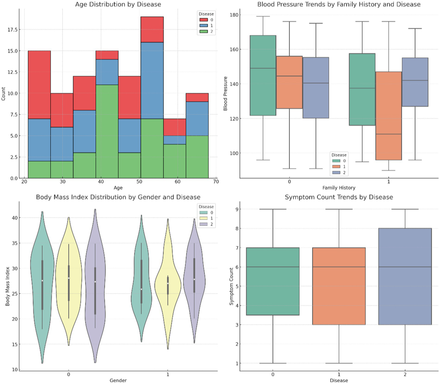 Figure 4 provides comparative visuals of various variables, such as age, symptom count, blood pressure, body mass index (BMI), and cholesterol levels. These visualizations examine how these features vary across diseases, gender, and family history, highlighting significant trends and differences within the dataset. Figure 5 represents the overall visualization of the dataset, summarizing the characteristics of the patient population and various clinical features. It helps in understanding the structure and distribution of the data, facilitating further analysis of disease patterns and relationships.