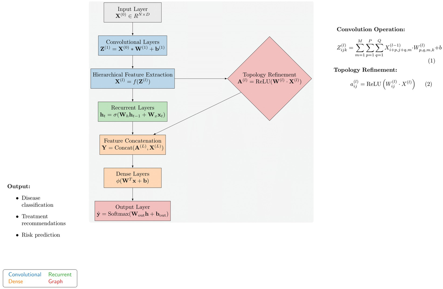 The ImmunoNet architecture is designed to process multi-source data, including genetic, clinical, and molecular information. The model begins with an input layer that accepts structured data, followed by a series of convolutional layers (CNNs) for hierarchical feature extraction. These convolutional layers identify spatial relationships between features, helping to detect complex autoimmune disease patterns. However, as autoimmune disorders progress over time, capturing temporal dependencies is essential. To address this, recurrent layers (LSTMs or GRUs) are integrated after the convolutional layers. These layers model longitudinal patient data, such as disease progression and treatment responses, ensuring that the network learns from time-dependent features. Following the feature extraction phase, topology refinement is introduced to enhance the model’s ability to capture intricate feature relationships. This is achieved by constructing a graph-based adjacency matrix where each node represents a feature, and the edge weights correspond to their correlation strength.