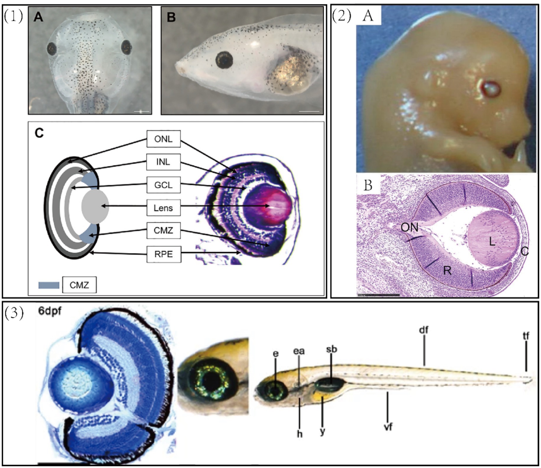 Figure 1. (1) Xenopus laevis tadpole. (A) A dorsal view of a 6-day old swimming tadpole. (B) A side view of the same tadpole. (C) A schematic (left) and transverse section (right) of the tadpole retina. ONL, outer nuclear layer—rod and cone photoreceptors; INL, inner nuclear layer—bipolar, horizontal, and amacrine cells; GCL, ganglion cell layer—retinal ganglion cells and amacrine cells; CMZ, ciliary margin zone—containing retinal stem cells, blue regions at the periphery of the lens. The outer layer covering the eye is the outer corneal epithelium and the layer directly adjacent to the lens is the inner corneal layer. Scale bar = 500 μm (111). (2) (A) Gross morphology of mouse eyeball. (B) Cross-sectional view of the eye (H&E staining). Bar = 250 um. C, cornea; L, lens; ON, optic nerve; R, retina (112). (3) Gross morphology and cross-sectional staining of zebrafish eye. e, eye; ea., ear; h, heart; y, yolk sac; sb, swimbladder, df, dorsal fin; tf, tail fin. Scale bars = 100 μm (113).