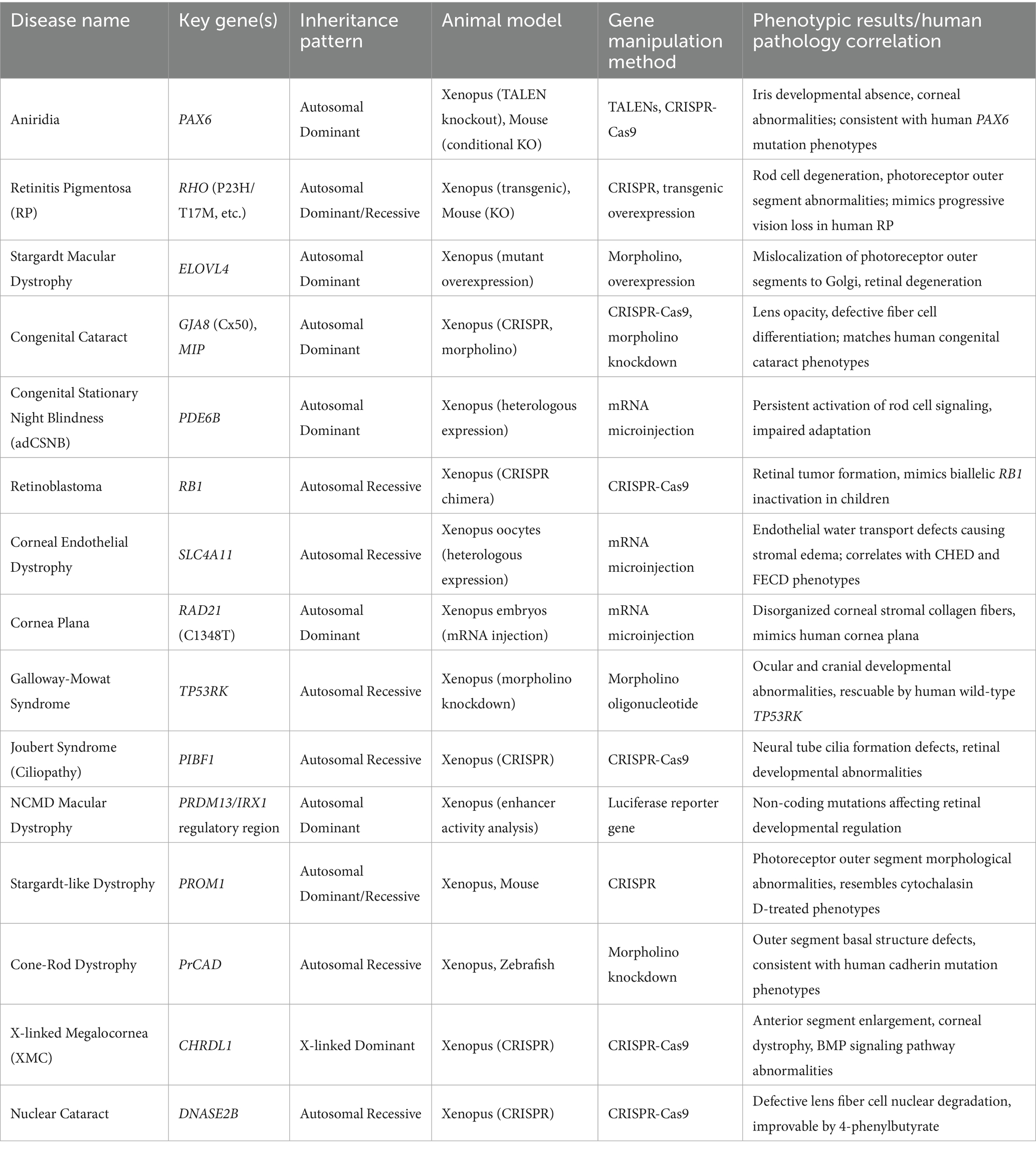Dozens of genes associated with congenital hereditary cataracts have been identified using animal models. These genes primarily encode lens proteins, connexins, membrane proteins, extracellular matrix components, cytoskeletal proteins, and transcription factors such as FOXE3, HSF4, MAF, and PITX3 (96). Injection of low doses of morpholino oligonucleotides in X. laevis tailbud stages induces a subtle lens phenotype resembling cataracts (97). Knockout of mammalian homologs of cataract-associated genes, such as TMEM114, CHRLD1, SIPAL3, or CELF1, results in ocular phenotypes loosely associated with cataracts (98, 99). Inactivation of three genes in X. laevis via CRISPR/Cas9 revealed lens-specific defects. Mutants of the gap junction protein and nuclease gja8 exhibited lens opacity, nuclear degradation, and fiber cell organization defects, while dnase2b mutants had normal external morphology but impaired fiber cell differentiation. The potential therapeutic effect of the chemical chaperone 4-phenylbutyrate was demonstrated by improving vision in gja8 mutant tadpoles (96). Connexin 50 (Cx50) is one of the most commonly mutated genes associated with congenital cataracts. The Cx50T39R mutation exhibits dominant effects in X. laevis, resulting in significantly enhanced hemichannel currents, altered voltage gating, and induced cell death. All-atom molecular dynamics simulations revealed that the R39 substitution stabilized an open-state conformation of the N-terminal domain, leading to lens cytotoxicity and cataract formation (100). Mutations in RNA granule component TDRD7 cause pediatric cataracts. In X. laevis, unilateral knockdown of Hspb1 at stage 42 resulted in defects in eye and lens development, which were rescued by co-injection of mouse Hspb1 mRNA (101). In a four-generation Chinese family with congenital cataracts, a novel missense mutation in the MIP gene, c.572C > G (p. P191R), was identified. Swelling assays in X. laevis oocytes showed that the P191R mutation reduced oocyte swelling rates by impairing MIP protein trafficking and decreasing its membrane localization, leading to cataract formation (102).