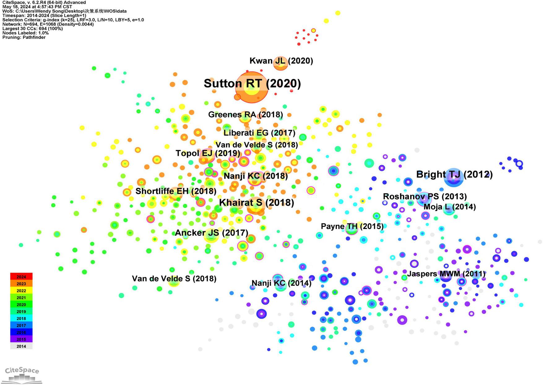 Reference citation refers to one reference is cited by at least two other references, allowing for the prediction of research hotspots and trends within a specific timeframe in a given research field. Utilizing CiteSpace software to analyze the cited literature as nodes, a total of 694 nodes and 1,068 connections were identified (Table 3; Figure 5). Between 2014 and 2024, 694 research papers in this domain were cited as core references. The top five cited references are ranked as follows: the first is a review of clinical decision support systems, which provides an overview of their application in medicine, encompassing various types, effective use cases, common pitfalls, and potential hazards. Evidence-based recommendations are proposed to mitigate risks in the design, implementation, evaluation, and maintenance of CDSS. The second most frequently cited article is a systematic review that discusses the role of CDSS, indicating that both commercially available and locally developed systems can effectively enhance various healthcare process measures. The third most frequently cited analysis primarily examines the reasons behind physicians’ reluctance to utilize CDSS, proposing two major models for CDSS design: user acceptance and system adaptive design models, along with input-output participation models. The fourth most frequently cited study is a retrospective cohort analysis investigating the impact of workload, work complexity, and repeated alerts on alert fatigue in CDSS, utilizing electronic health record data from 112 primary care physicians in outpatient settings. The findings reveal that clinicians are increasingly less likely to accept alerts due to the high volume of alerts received, particularly repeated ones. The fifth most frequently cited literature explores the relationship between computerized clinical decision support systems and absolute improvements in nursing, employing a meta-analysis.