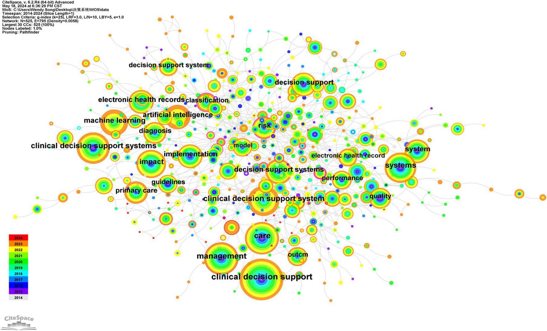Keywords are essential components of an article, reflecting the prevailing topics within the relevant field. Utilizing CiteSpace software for literature analysis, we identified 525 nodes and 795 connections (Figure 6). The top 20 keywords, based on the frequency of clinical decision support system-related literature published from 2014 to 2024, are summarized in Table 4. The keywords with high frequency of occurrence are categorized into three groups: ① Purpose of establishing CDSS—including clinical decision support, care, management, decision support, electronic health records, and primary healthcare; ② Functional Status and Design Optimization—encompassing systems, machine learning, decision support systems, and artificial intelligence; ③ Application situation—addressing impact, implementation, diagnosis, risk, and quality.