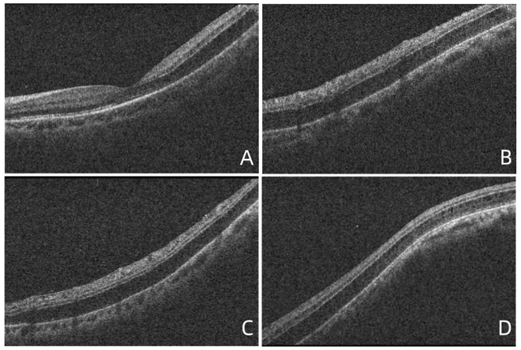Four optical coherence tomography (OCT) images labeled A, B, C, and D show cross-sectional views of the retina. Each image depicts varying degrees of retinal layers and structures, used in diagnosing eye conditions.