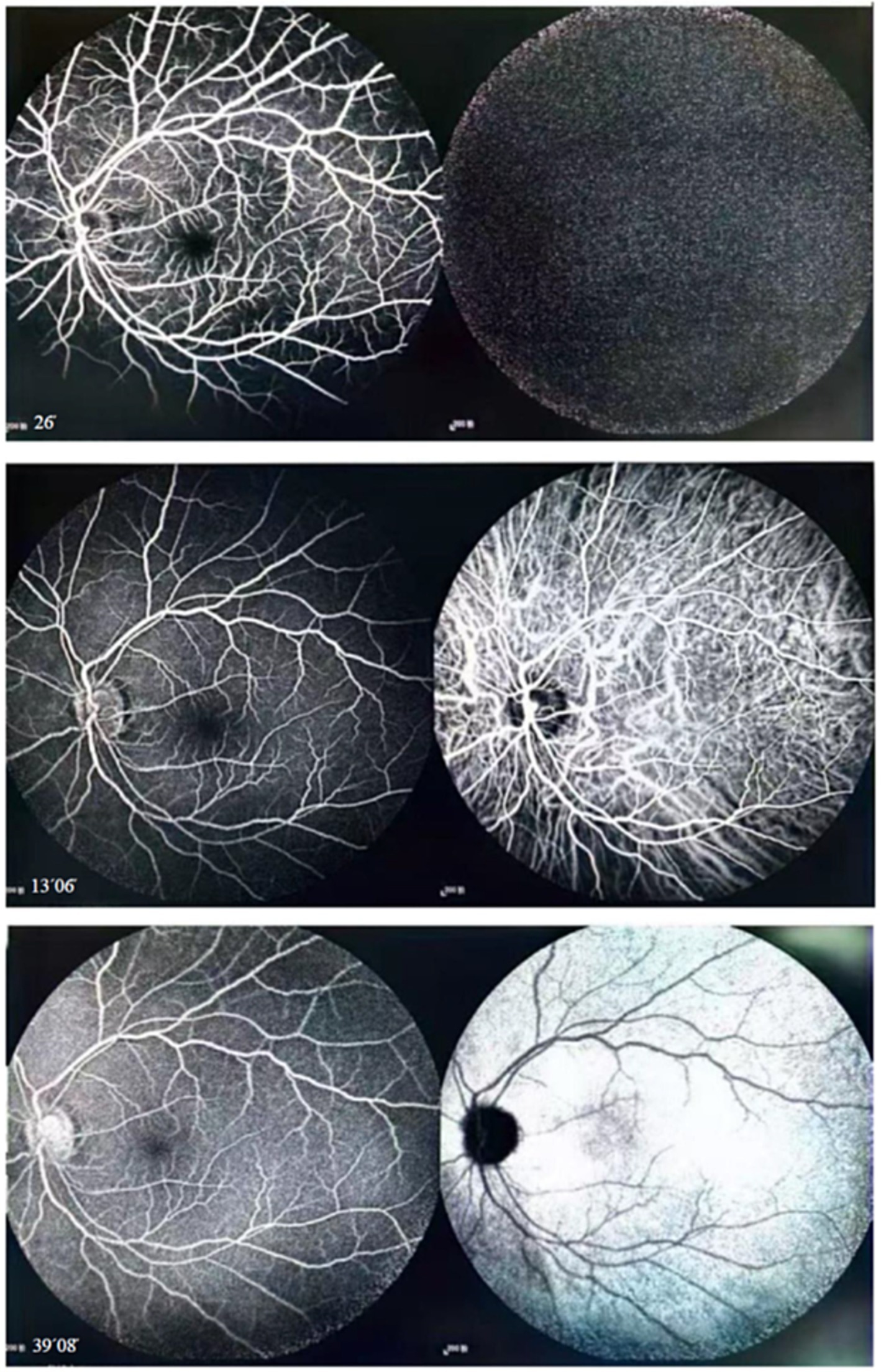 A set of three optic scans is shown. Each pair displays different stages of retinal blood flow viewed through fluorescein angiography. The left and right images in each pair emphasize different details of vascular patterns in the retina, depicting various levels of dye filling and visibility of blood vessels over time.