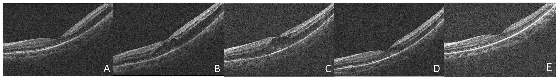 Five optical coherence tomography (OCT) images labeled A to E show progressive changes in retinal structure. Each image displays a cross-sectional view of the retina, highlighting varying degrees of thickness and formation, with labels indicating nasal (N) and temporal (T) orientation.