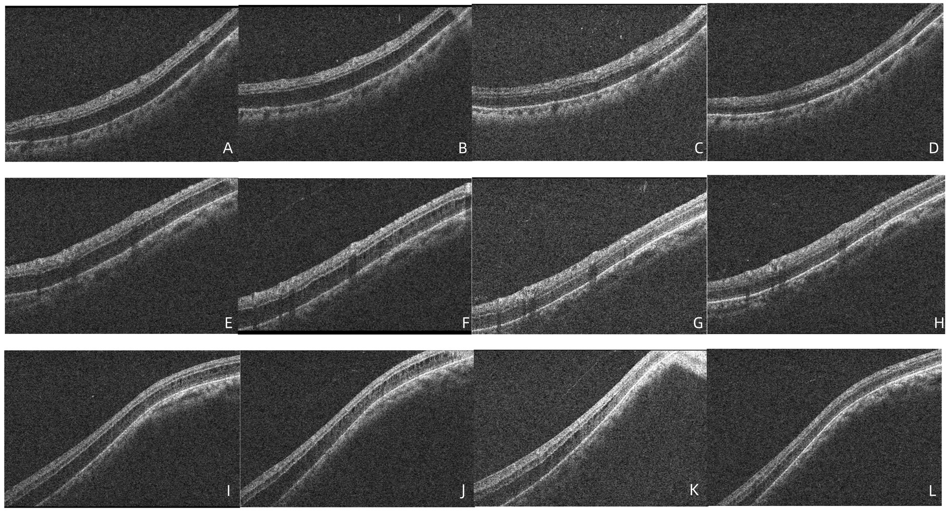 Figure 4. (A–D) OCT demonstrated that no significant improvement in retinoschisis near the inferior vascular arch 2 weeks after diagnosis, 27 days after diagnosis, the retinoschisis cavity was reduced, 40 days after diagnosis, the retinoschisis had completely resolved. (E–H) OCT demonstrated that no significant improvement in retinoschisis near the superior vascular arch 2 weeks after diagnosis, 27 days after diagnosis, the retinoschisis cavity was reduced, 40 days after diagnosis, the retinoschisis had completely resolved. (I–L) OCT demonstrated that no significant improvement in retinoschisis near the temporal side of the macula 2 weeks after diagnosis, 27 days after diagnosis, the retinoschisis cavity was reduced, 40 days after diagnosis, the retinoschisis had completely resolved.