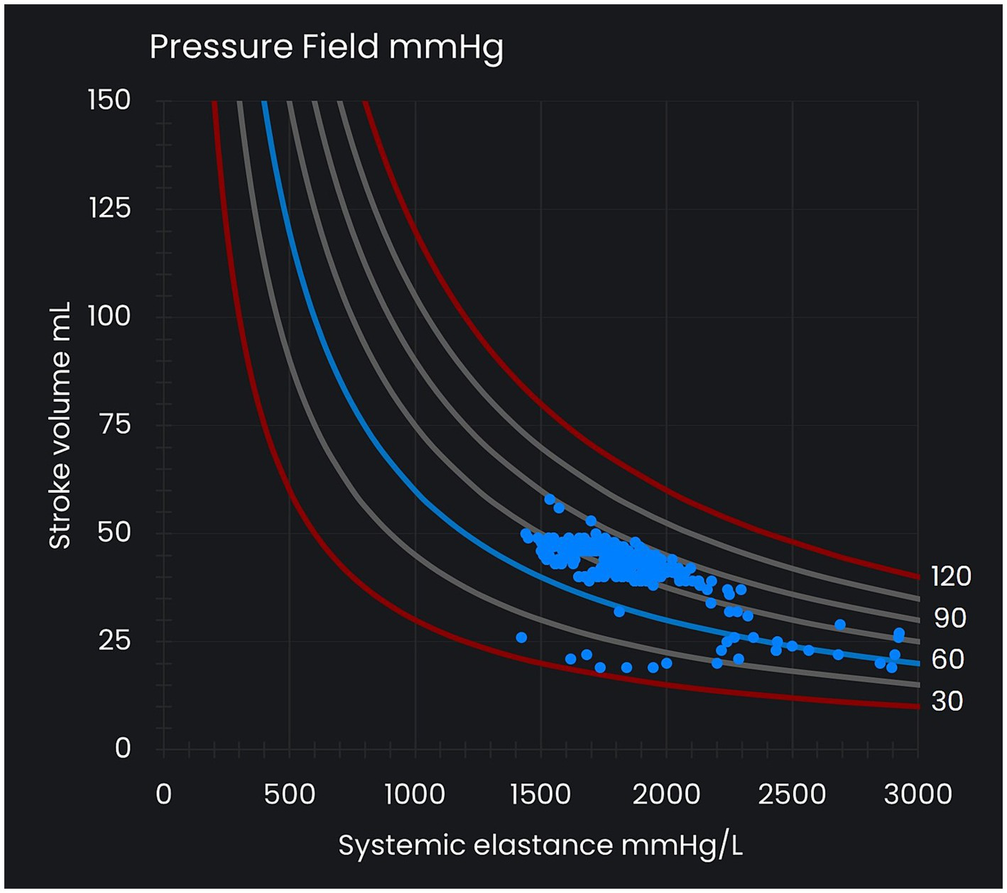Pressure field visualization. The x-axis represents systemic elastance (Esys) as a measure of vascular tone, and the y-axis represents stroke volume (SV), which varies with preload and contractility. The curved lines represent reference lines for mean perfusion pressure (MPP) at intervals of 15 mmHg and between 30 mmHg and 120 mmHg. Each MPP value (that is, [MAP – CVP] value) is consistent with many different SV and Esys values. Each dot in the pressure field visualization represents a time/data point.
