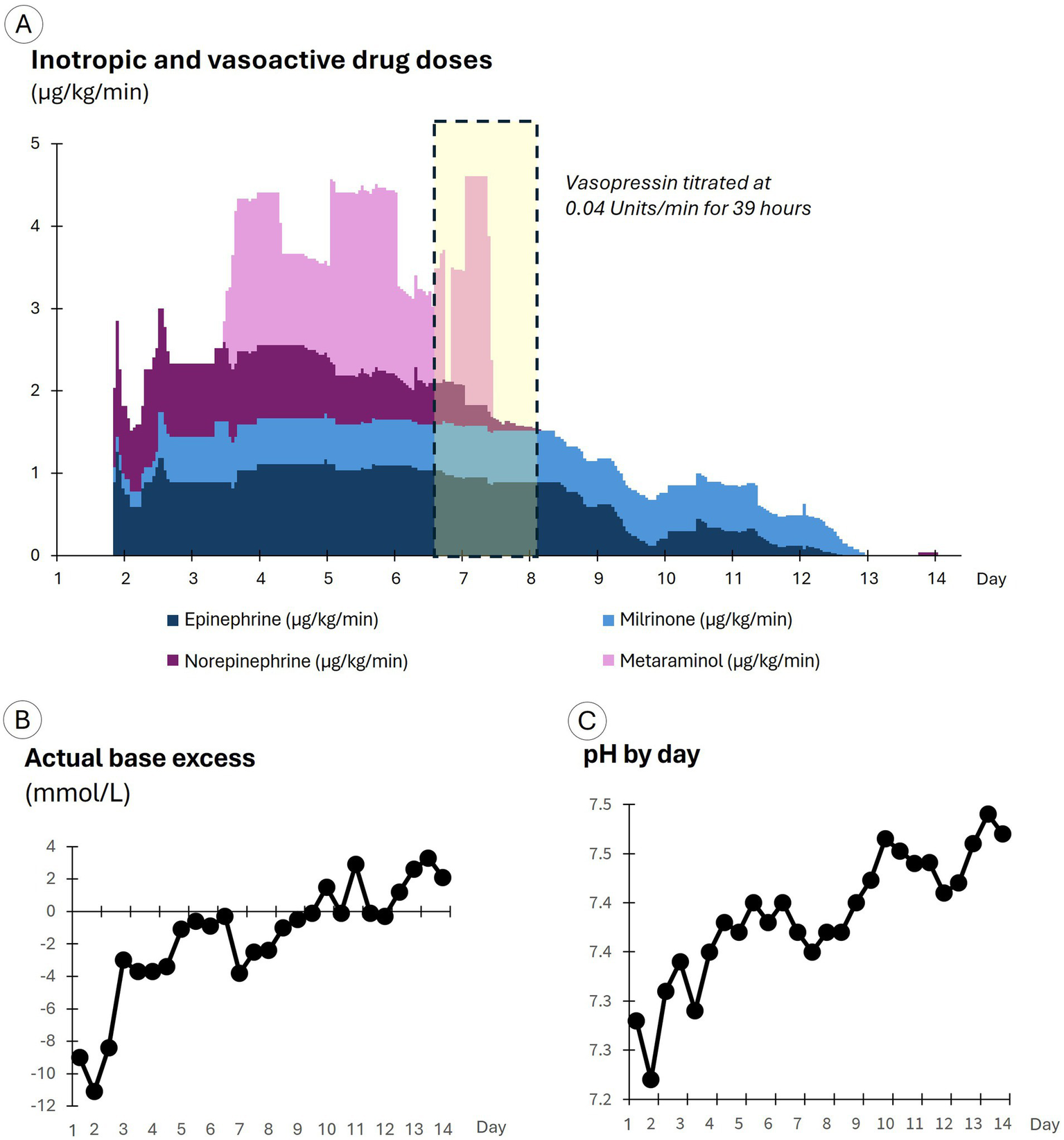 Drug doses and arterial blood gas results by day of care. (A) Displays inotropic and vasoactive drug doses. (B) Displays the actual base excess results. (C) Displays pH results.