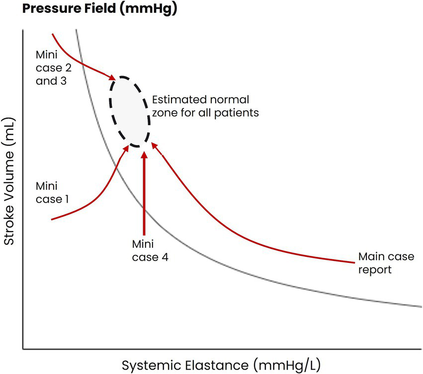 The second element of pressure field management involves identifying and managing personalized hemodynamic zones defined in terms of MPP, SV, and Esys. Explicitly estimating a patient’s pre-morbid pressure field values usefully informs management. We intend to publish further guidance; however, a useful rule of thumb for the normal adult population is an SV of 1.1 mL/kg/beat and an MPP of 80–100 mmHg (9). For the primary patient reported, given the history of viral cardiomyopathy, the target SV was revised downward.