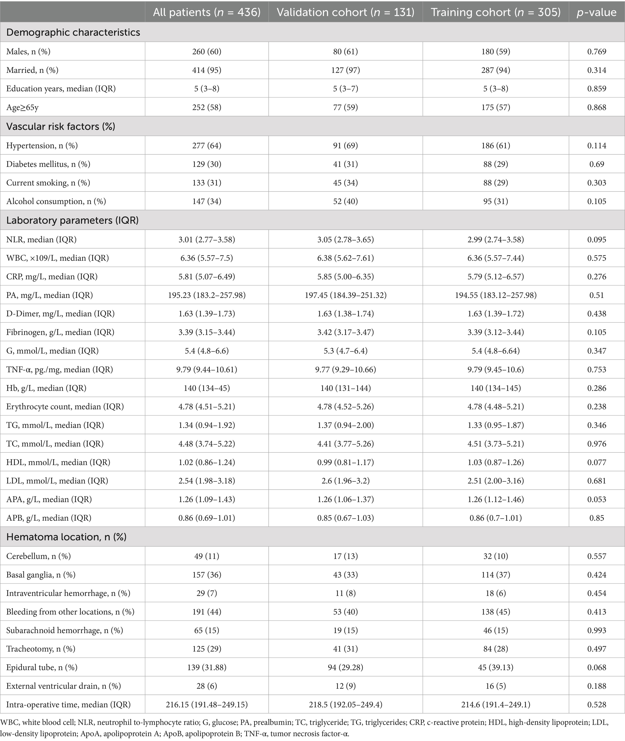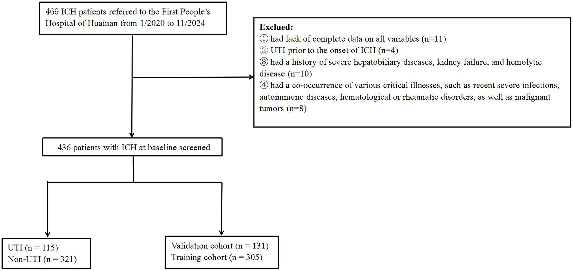 Our investigation was structured as a single-center prospective cohort study, carried out at the First People’s Hospital of Huainan from January 2020 to November 2024. This study was approved by the ethics committee of First People’s Hospital of Huainan, (approval no. of ethics committee: HN-IRB20200120). In accordance with the principles set forth in the Declaration of Helsinki, all participants provided their written informed consent. Patients with ICH were consecutively recruited in this study (n = 469). The identification of UTI was established during the hospital stay following surgical intervention when patients exhibited isolated acute dysuria, or presented with fever accompanied by at least one of the subsequent symptoms: increased urinary frequency, urgency, or retention; incontinence; visible hematuria; alterations in urine properties; or tenderness in the suprapubic region or costovertebral angle. This diagnosis was further supported by the detection of ≥10^3 colony-forming units of any organism in the urine culture (17, 18). Meanwhile, the healthy control group consisted of the age and sex matched individuals who came to our hospital for healthy examination between May 2020 and June 2024. Controls (100 healthy individuals) were composed of 60 males and 40 females. The inclusion criteria were as follows: (1) must be over 18 years of age and sign informed consent; (2) ICH was confirmed by clinical symptoms and computed tomography (CT); (3) patients underwent surgical treatment for ICH. Participants were not included if they: (1) had lack of complete data on all variables; (2) experienced a UTI, prior to the occurrence of ICH; (3) had a history of severe hepatobiliary diseases, kidney failure, and hemolytic disease; (4) had a combination with other serious urological diseases; (5) had a co-occurrence of various critical illnesses, such as recent severe infections, advanced liver and kidney conditions, autoimmune diseases, hematological or rheumatic disorders, as well as malignant tumors. All enrolled patients were divided into the training cohort and validation cohort based on the pre-seeded random number (123) generator in R software (version 4.4.2). Finally, the patients were randomly divided into training (n = 305) and validation (n = 131) cohorts based on the ratio of 7:3. At last, the study included 436 cases with ICH in total (Figure 1).