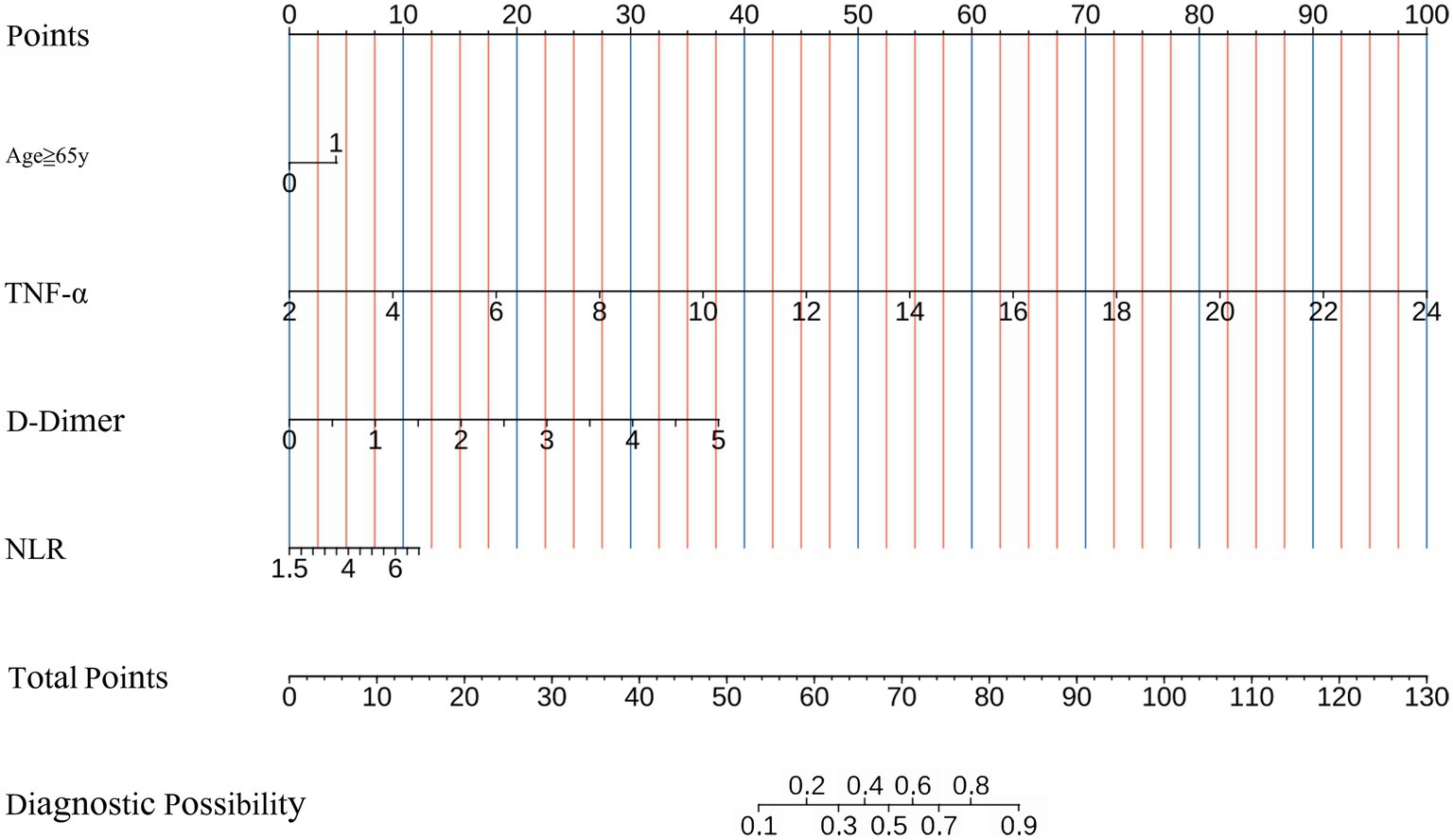 Nomogram for diagnostic possibility showing variables: Age ≥65 years, TNF-α, D-Dimer, and NLR with corresponding points. Total points correlate with diagnostic possibility, ranging from 0.1 to 0.9.