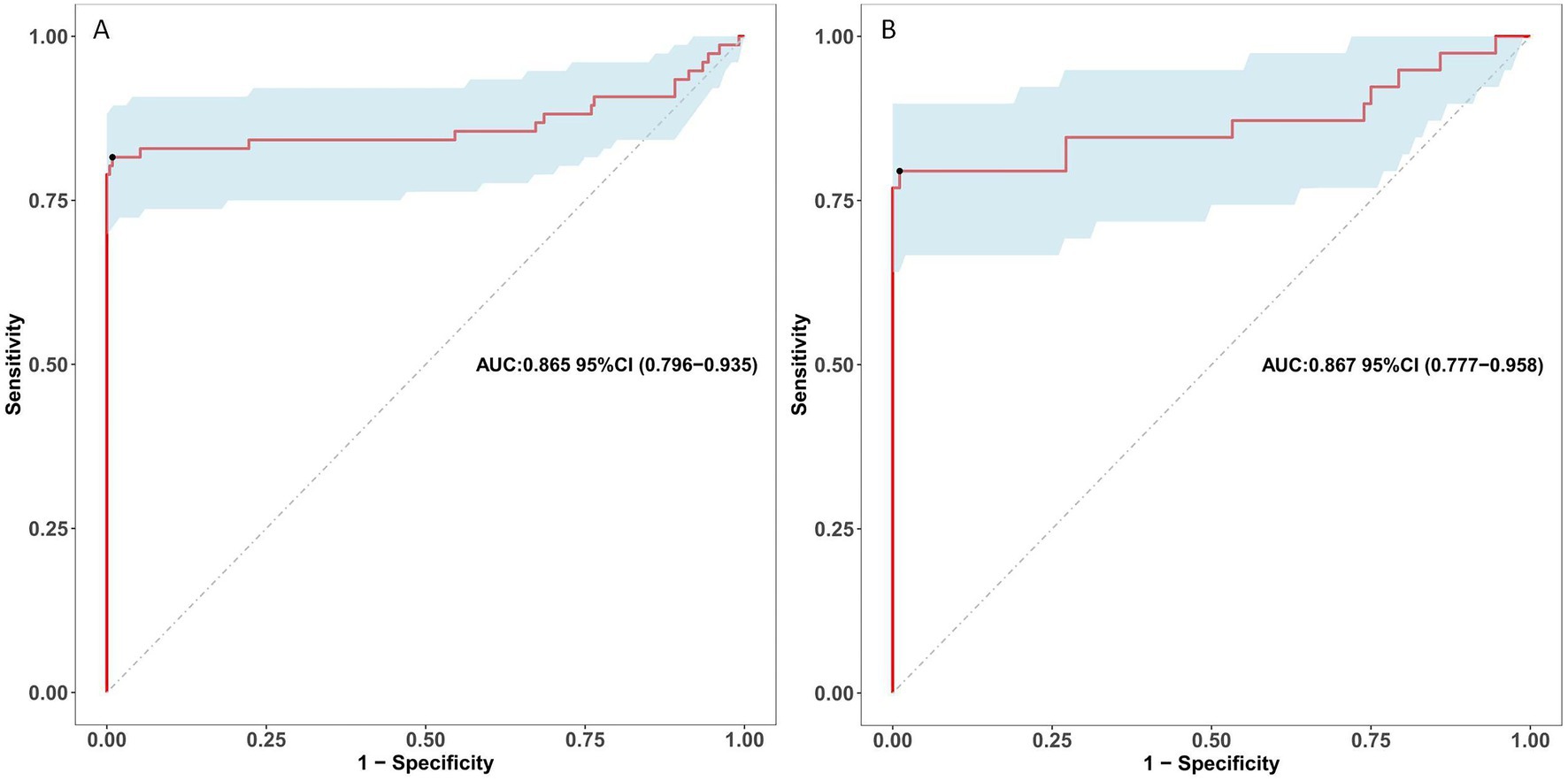 Two panels A and B show receiver operating characteristic (ROC) curves with sensitivity on the y-axis and one minus specificity on the x-axis. Panel A displays an AUC of 0.865 with a 95% confidence interval of 0.796 to 0.935. Panel B shows an AUC of 0.867 with a 95% confidence interval of 0.777 to 0.958. Both curves are highlighted in red with a blue shaded confidence interval.
