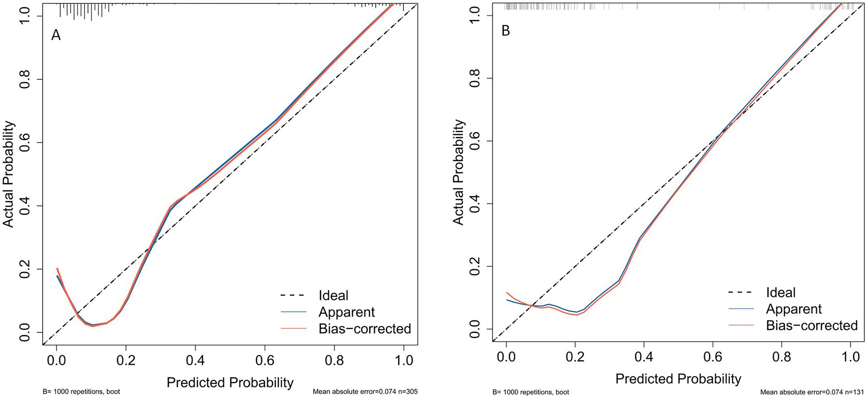 Two calibration plots labeled A and B compare predicted versus actual probabilities. Both plots feature dashed lines for ideal predictions, blue lines for apparent results, and red lines for bias-corrected results. Plot A shows a mean absolute error of 0.074 with 305 samples, while plot B shows the same error with 131 samples. Each plot involves 1000 bootstrap repetitions.