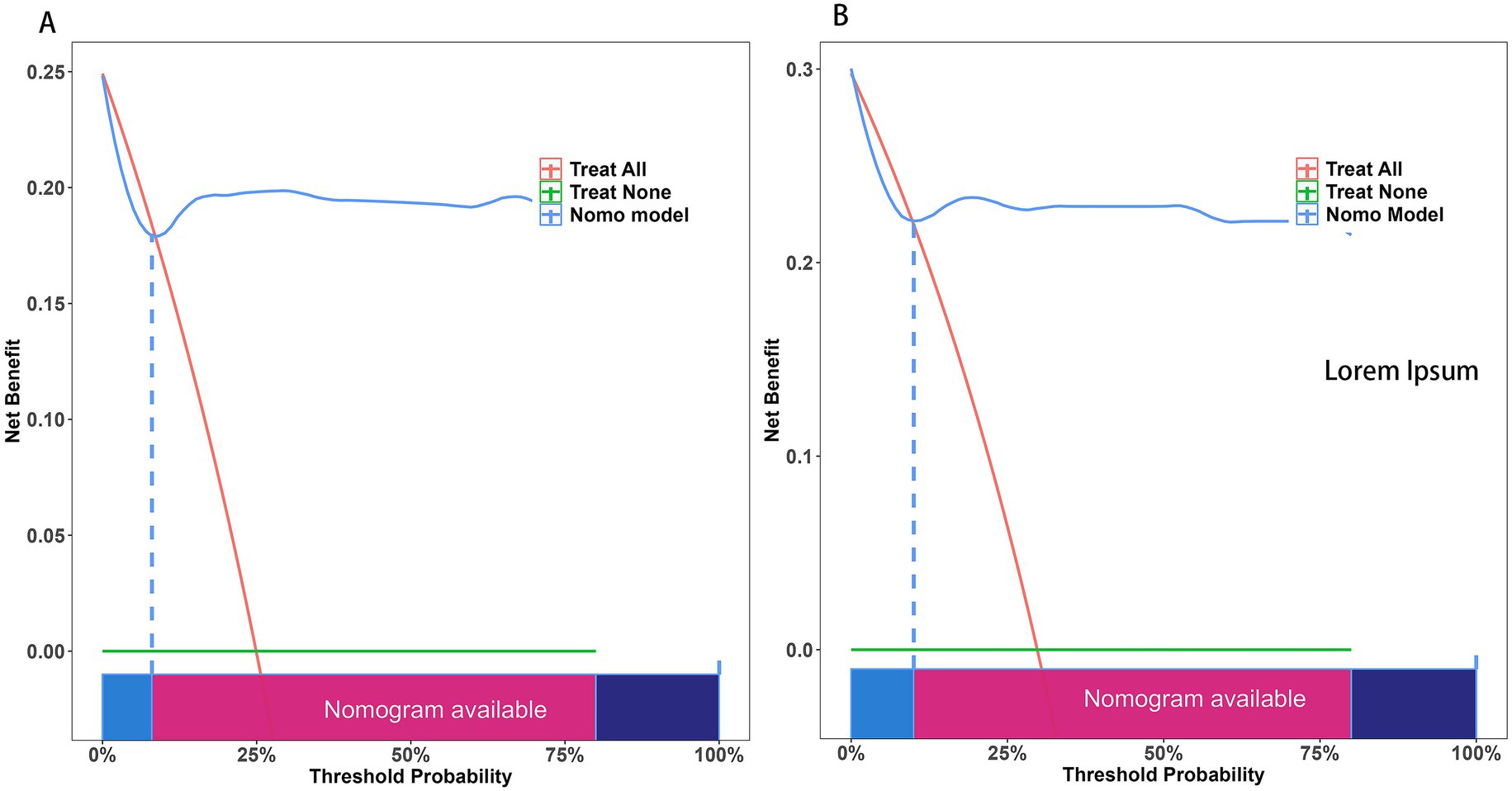 Two line graphs labeled A and B compare net benefit against threshold probability. Both graphs illustrate three lines: