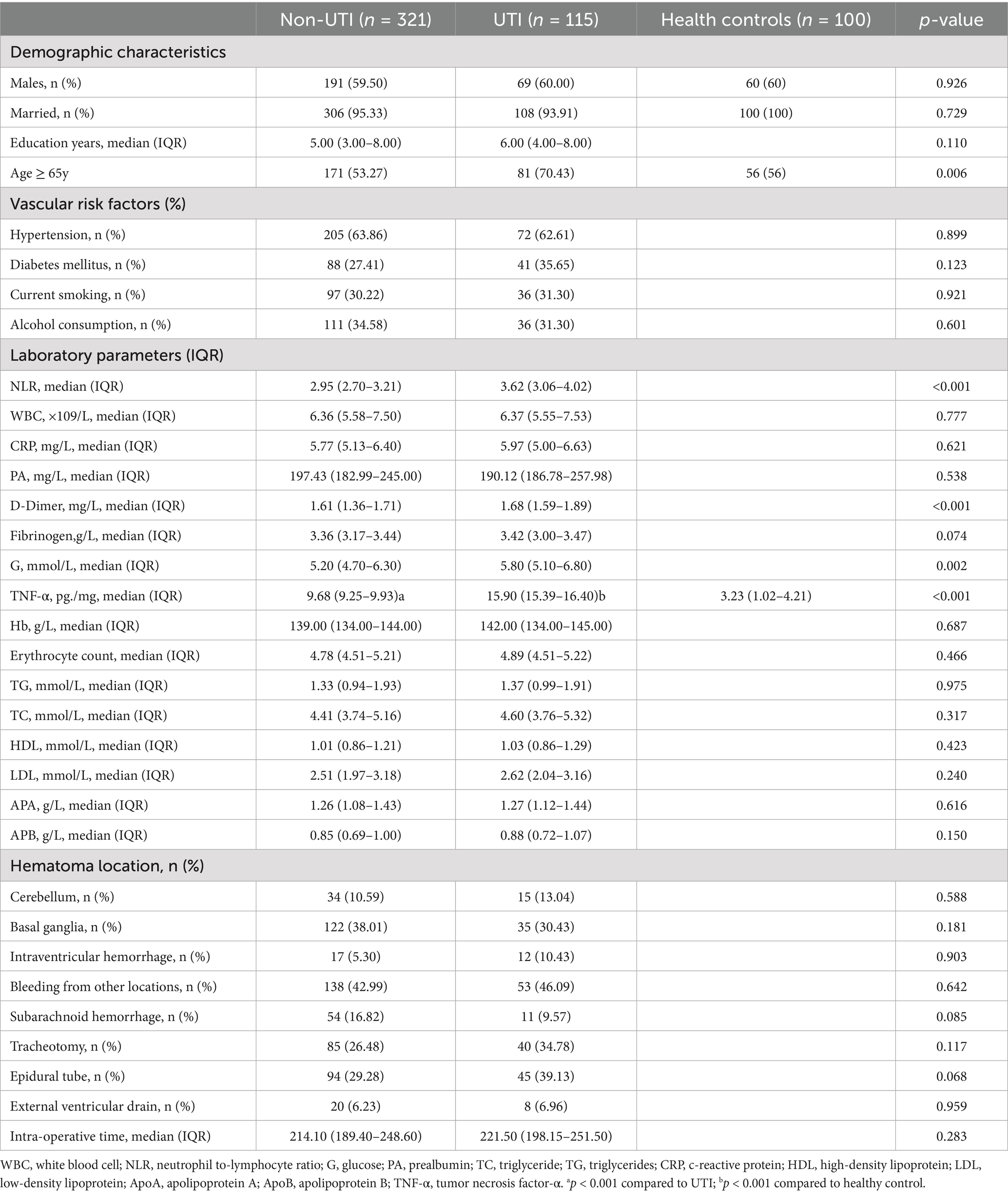Relative to patients in non-UTI group after ICH, those in UTI group presented higher proportions of age ≥65y (p = 0.002), higher NLR (p = 0.018), higher TNF-α (p = 0.011), higher G (p = 0.002), as well as higher D-Dimer (p < 0.001). The basic characteristics of the 436 patients were presented in Table 1. Indeed, the results also indicated that the TNF-α levels in the UTI group were significantly higher than those in the non-UTI group and the healthy control group (15.90 [15.39–16.40] vs. 28.99 [9.68–9.93] and 3.23 [1.02–4.21], p < 0.001).