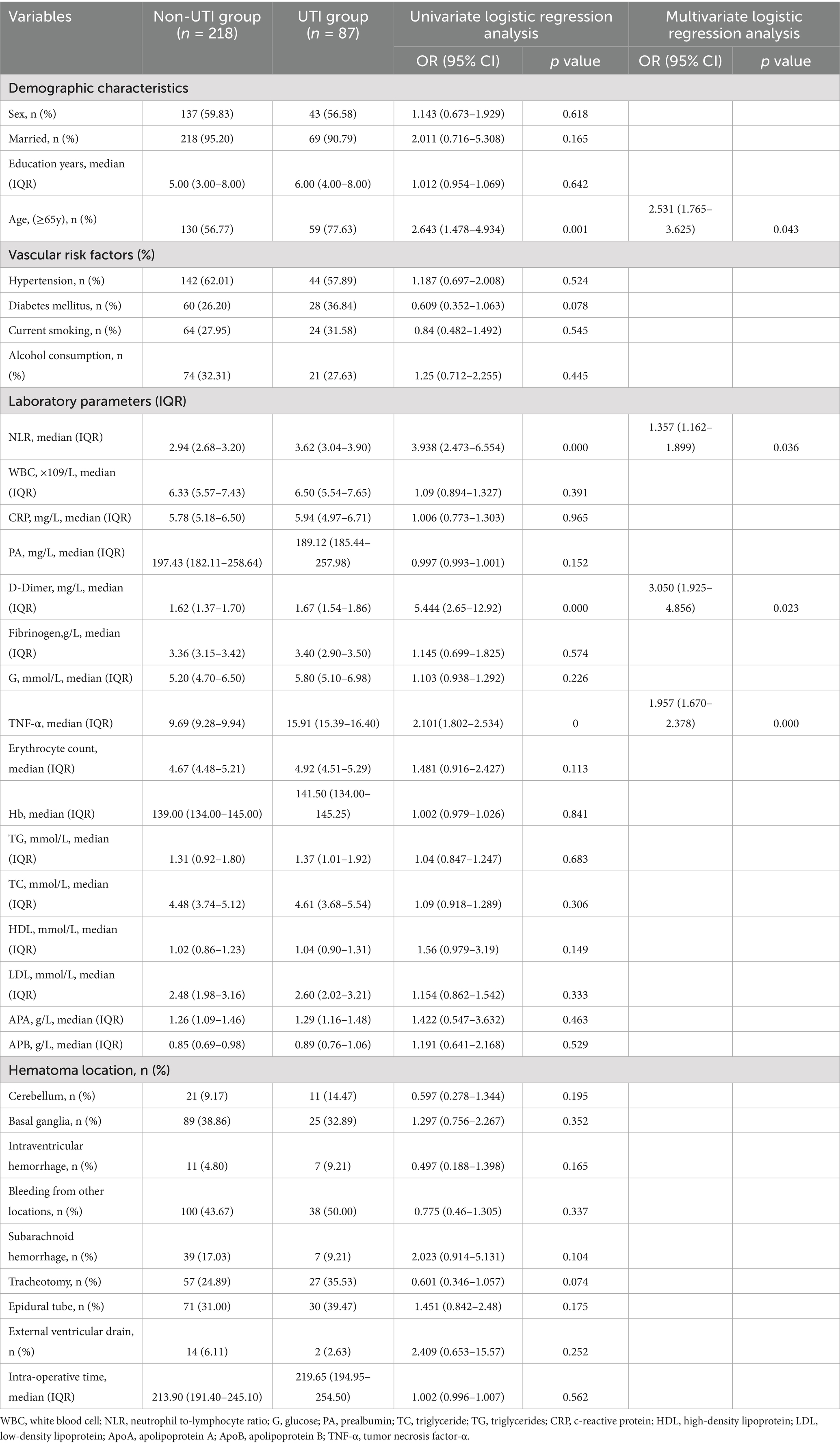 Conclusion: This study presents a new and practical nomogram that uses NLR, D-Dimer, TNF-α, and age 65 years or older to effectively predict the risk of postoperative UTI in patients with ICH.
