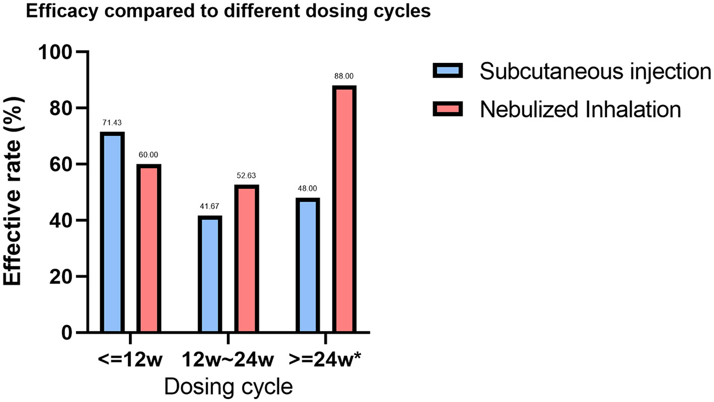 Therefore, we designed this study to investigate the impact of subcutaneous injection vs. nebulized inhalation on treatment outcomes and to identify an appropriate dose range.