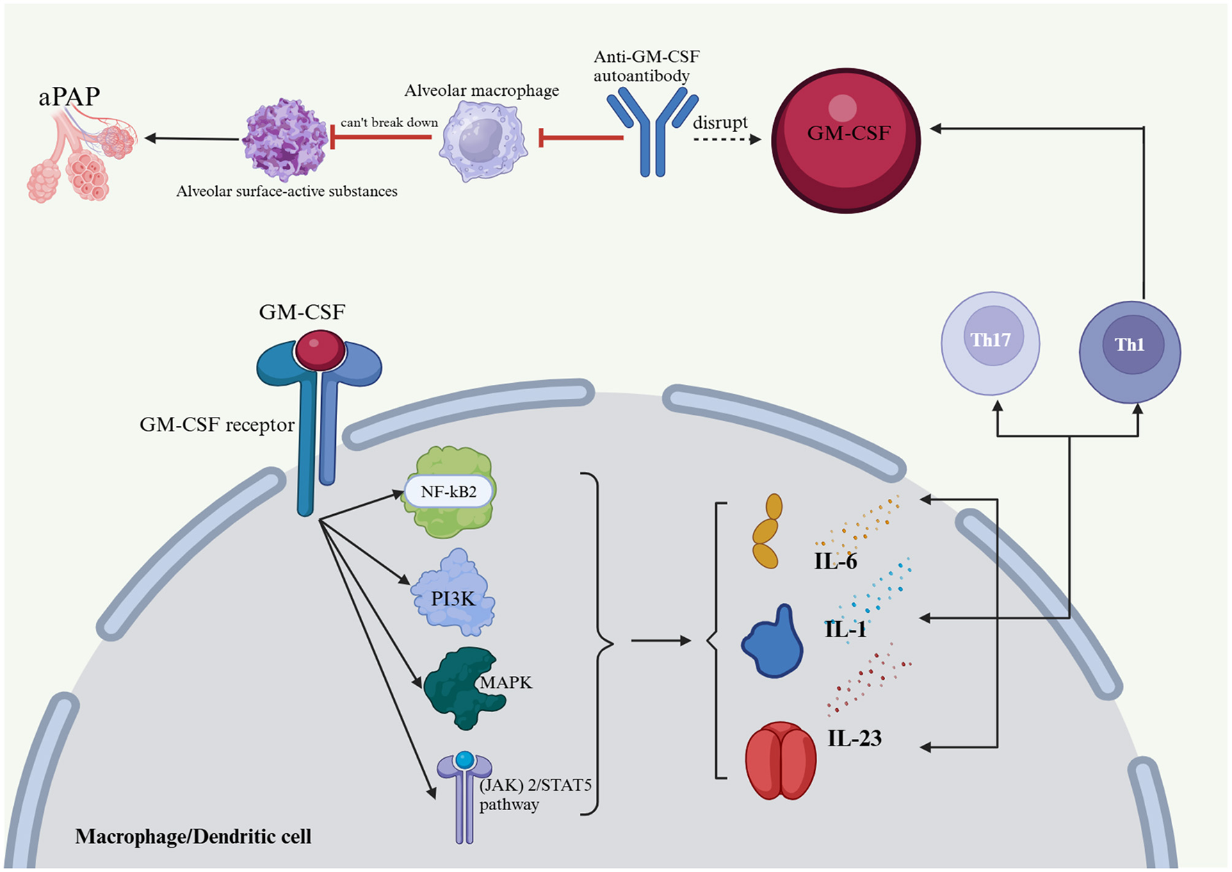 GM-CSF is a promising treatment for aPAP, as it restores alveolar macrophage function, improves surfactant clearance and gas exchange, and reduces the need for WLL (4, 6, 7). GM-CSF is a glycoprotein that stimulates the production and function of white blood cells, including granulocytes and macrophages (8). In the context of aPAP, GM-CSF increases the activity of alveolar macrophages, which are responsible for clearing excess surfactant from the alveoli. In aPAP, antibodies inhibit the effects of GM-CSF, leading to impaired macrophage function and surfactant accumulation. Administering GM-CSF can help restore macrophage function (9).