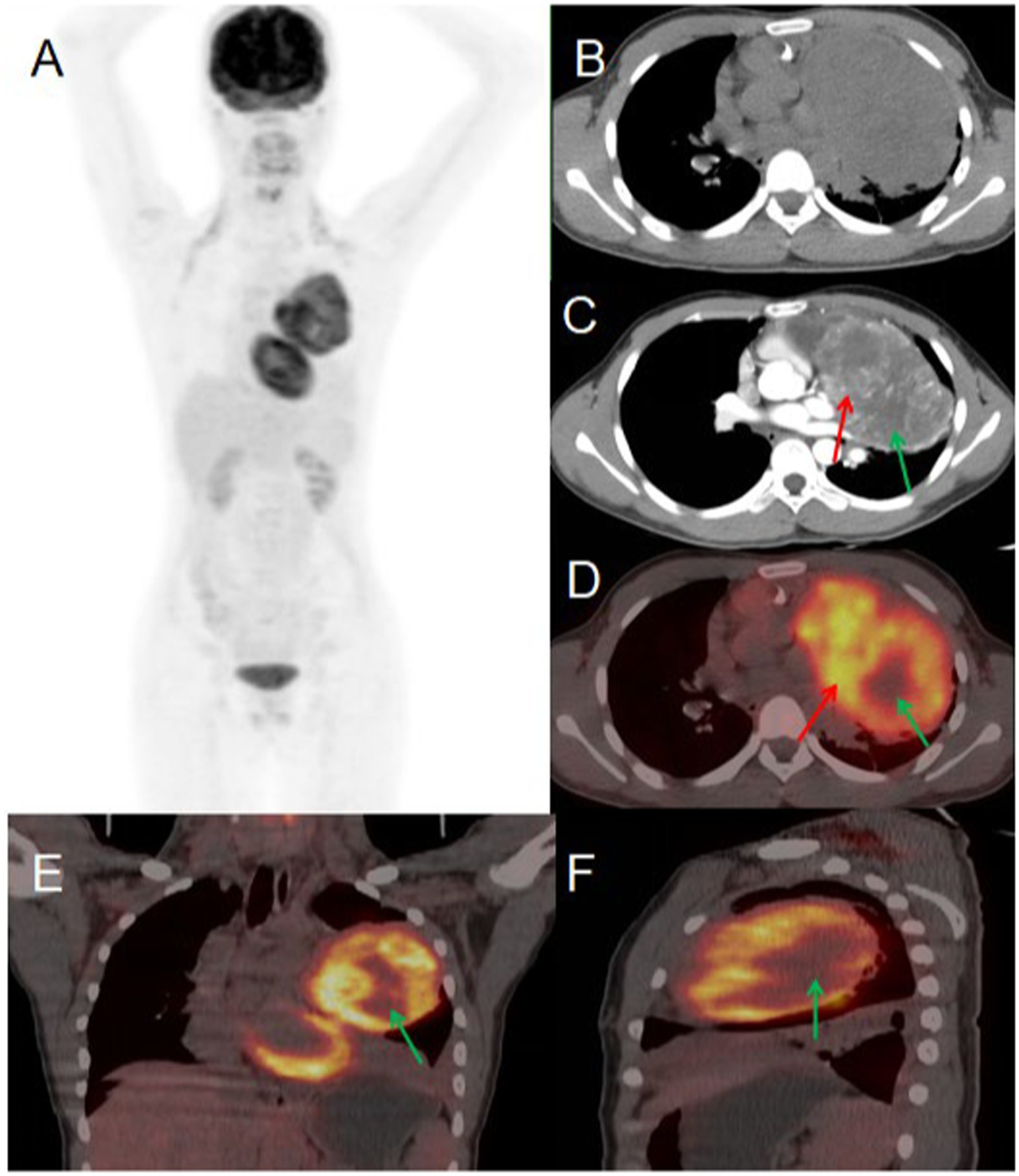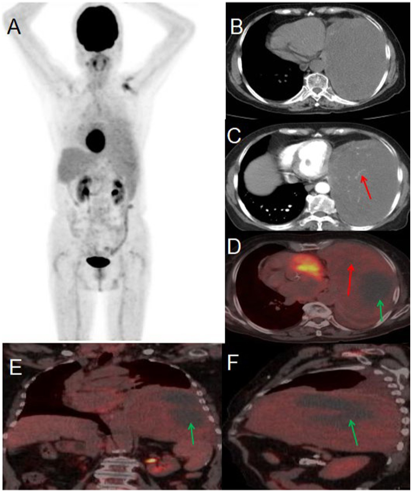 Female, 56 years old, malignant primary pulmonary solitary fibrous tumors. (A) Whole body MIP. (B) Axial, non-contrast-enhanced CT. (C) Axial, enhanced CT-arterial phase. (D) Axial fusion. (E) Coronal fusion. (F) Sagittal fusion. Contrast-enhanced CT findings: an approximately 81 × 101 mm soft tissue mass was identified in the left upper lobe, demonstrating: heterogeneous but significant enhancement in the solid components (red arrow, C). Non-enhancing areas corresponding to necrosis and cystic degeneration (green arrow, C). 18F-FDG PET/CT findings: the left upper lobe mass displayed: prominent necrotic-cystic degeneration throughout the lesion. Markedly increased FDG avidity in the solid components (SUVmax 9.6; red arrow, D). Absence of significant FDG uptake in the necrotic-cystic areas (green arrow, D–F).