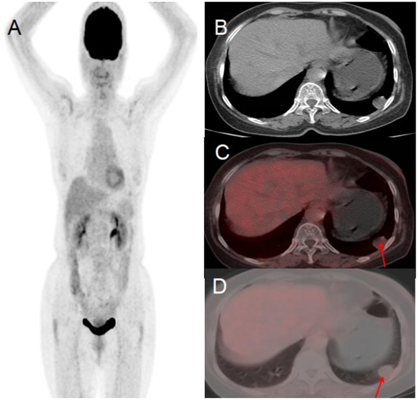 Female, 76 years old, benign primary pulmonary solitary fibrous tumors. (A) Whole body MIP. (B) Axial CT. (C) Axial fusion. (D) Axial fusion. PET/CT suggested a round lesion in the left lower lobe with mild FDG uptake, comparable to the background FDG uptake of the adjacent lung tissue (arrow, D).