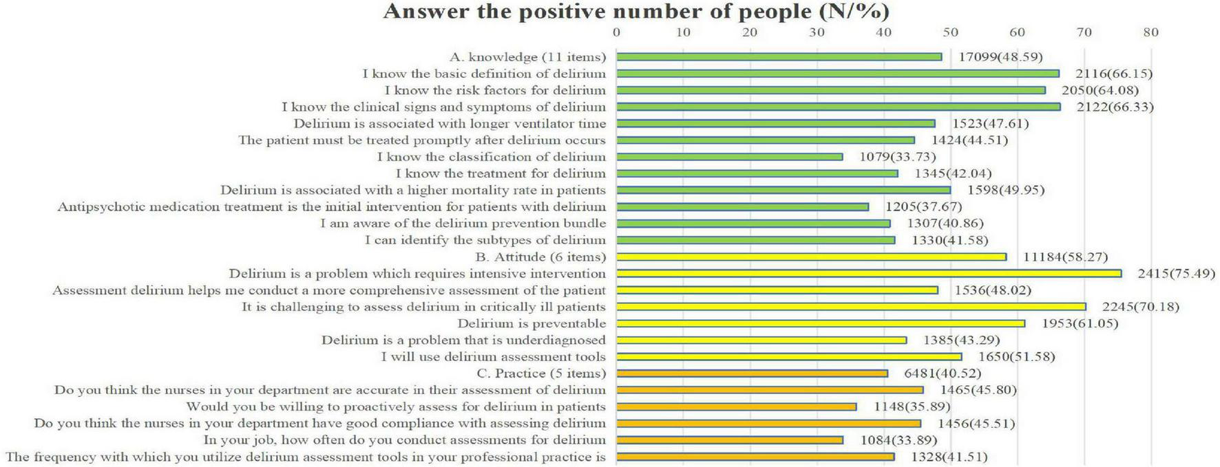 A total of 3,199 valid questionnaires were collected. Overall, the scores of ICU nurses’ knowledge, attitude, and practice regarding delirium assessment were 38.00 (33.00, 44.00), 23.00 (19.00, 26.00), and 16.00 (12.00, 19.00), respectively. Among the respondents, the proportions of individuals providing positive responses regarding their knowledge, attitude, and practice scores were 48.59%, 58.27%, and 40.52%, respectively. The attitude scores of the nurses were significantly related to knowledge scores (p < 0.001). Moreover, the scores for nurses’ practice show a significant correlation with their knowledge scores (p < 0.001) and attitudes scores (p < 0.001). Multivariate linear regression analysis showed a higher level of education (P = 0.037), surgical ICU (P = 0.02), private hospital (P < 0.001), clinical position (P = 0.007), shorter working hours (P < 0.001), primary professional title (P < 0.001), and previous experience in delirium nursing (P < 0.001)and training (P < 0.001)were related to higher practice scores.