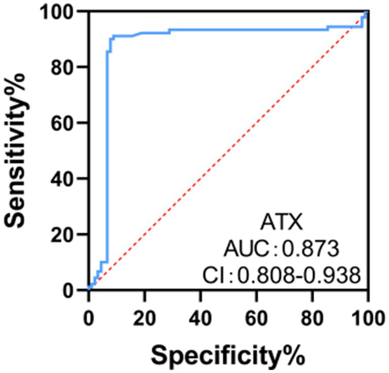 Figure 5. ROC curve analysis of the clinical value of ATX in diagnosing optic neuropathy in DR patients.