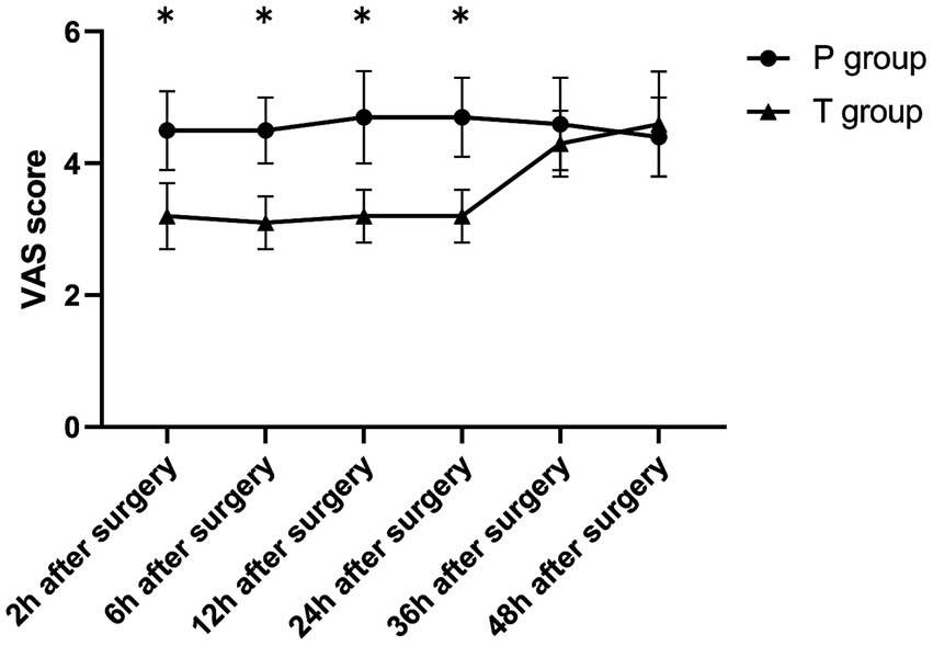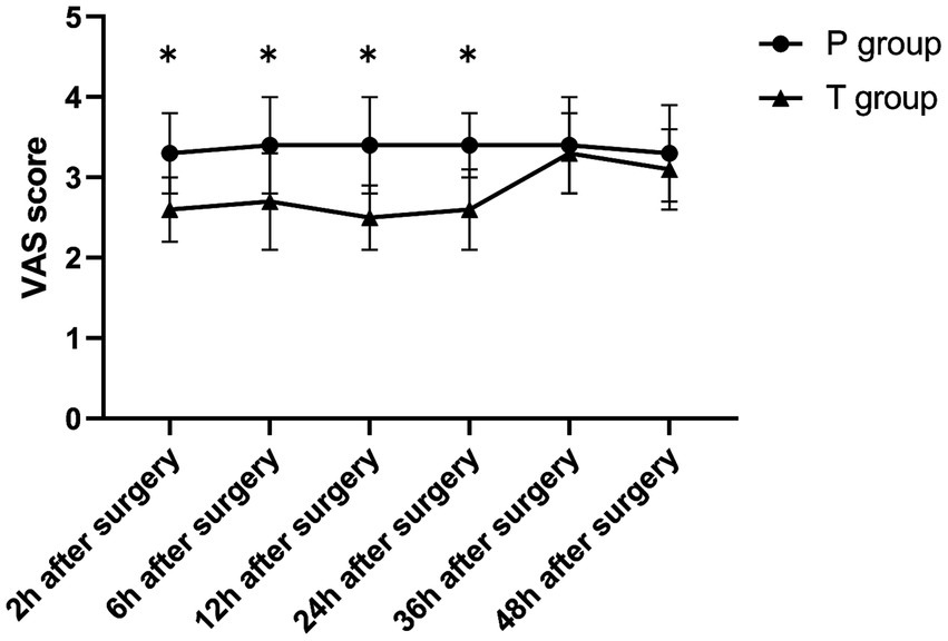 The VAS score (while coughing) after surgery. *p < 0.001 T group vs. P group.