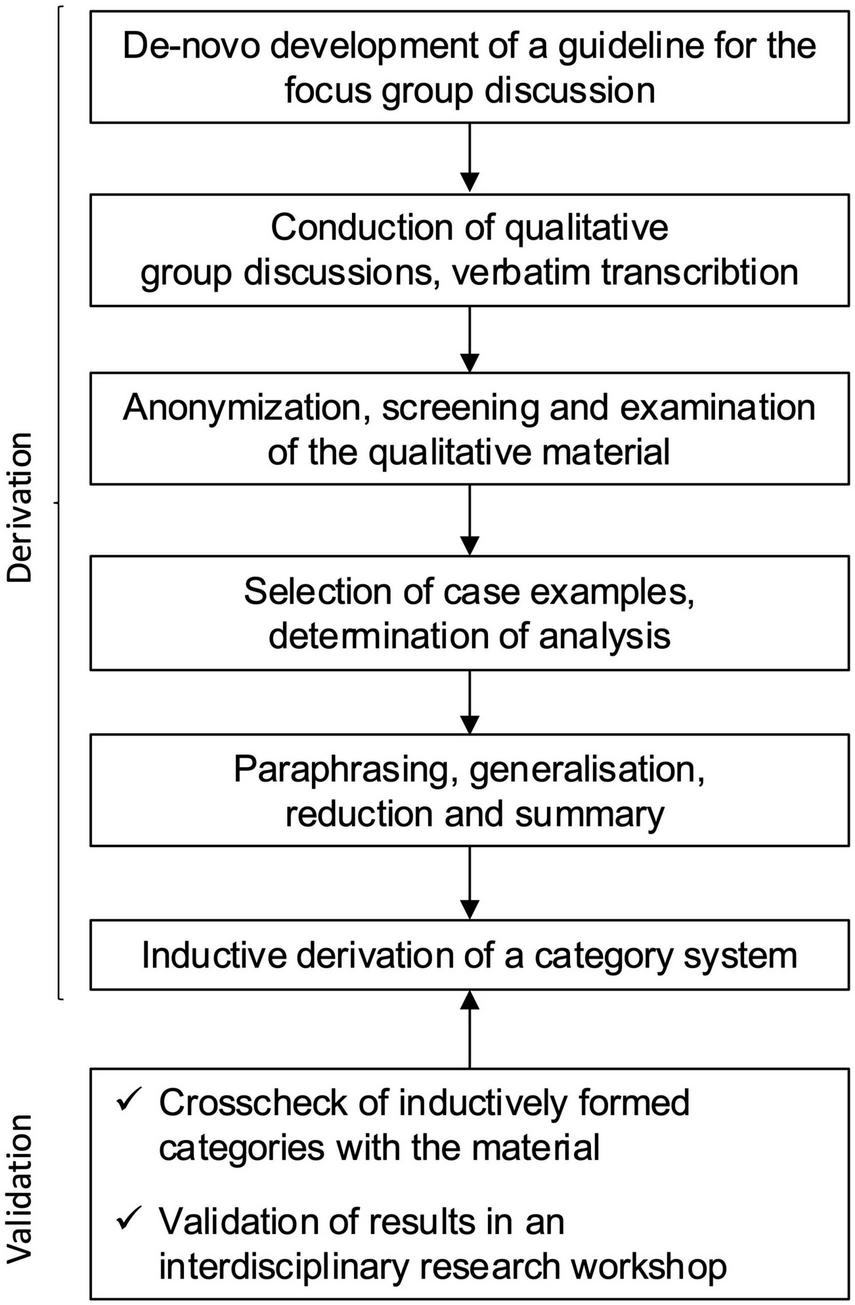 First, the material was carefully read and segmented into meaning units. These units were then paraphrased to preserve the core message in simplified terms. In the next step, these paraphrases were generalized to a higher level of abstraction, making them applicable across different contexts. Through a process of reduction, redundant or less relevant content was condensed, while still maintaining the essence of the statements. These abstracted segments were subsequently summarized and grouped to form initial thematic categories. The category systems and themes were developed inductively from the data, rather than based on predefined codes, ensuring that they remained closely tied to the participants’ perspectives expressed in the group discussion (7).