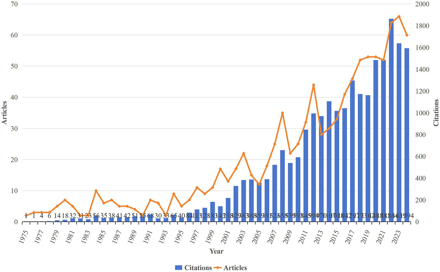 From January 1, 1975, to October 31, 2024, a total of 1,021 HA-related publications spanning a period of 49 years were retrieved. The study workflow is shown in Figure 1. Figure 2 shows the annual and cumulative publication volumes of HA-related literature. Overall, an increasing trend in the number of HA-related annual publications was noted. During the period from 1975 to 1999, only a handful of studies were published in this field, and after the year 2000, the number of publications generally shows a continuous upward trend. The year with the most publications was 2023, which had 66 published papers. An upward trend in the annual citation frequency of HA-related literature was also noted. The year 2022 was found to have the highest annual citation frequency of the literature at 1864.