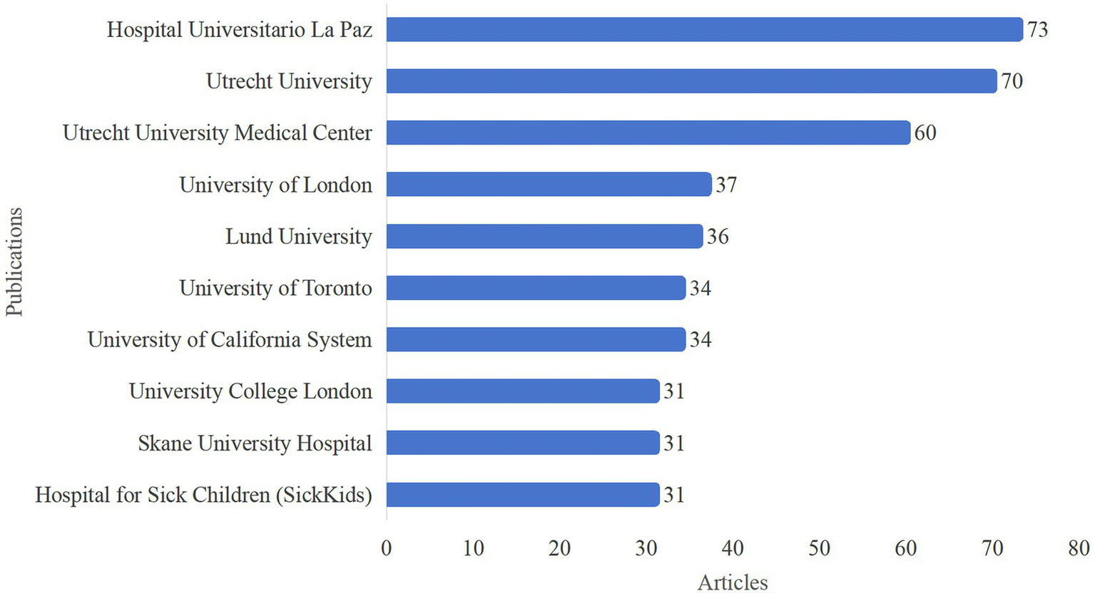 Overall, a total of 1,235 institutions have conducted HA-related research. The top 10 institutions are shown in Figure 4. Hospital Universitario La Paz in Spain had the highest number of publications (73) and ranked first, followed by Utrecht University (70) and Utrecht University Medical Center (60). Among these 10 institutions, two were from the Netherlands, two from Sweden, two from the United Kingdom (UK), and two from Canada; the remaining institutions were from the USA and Spain.