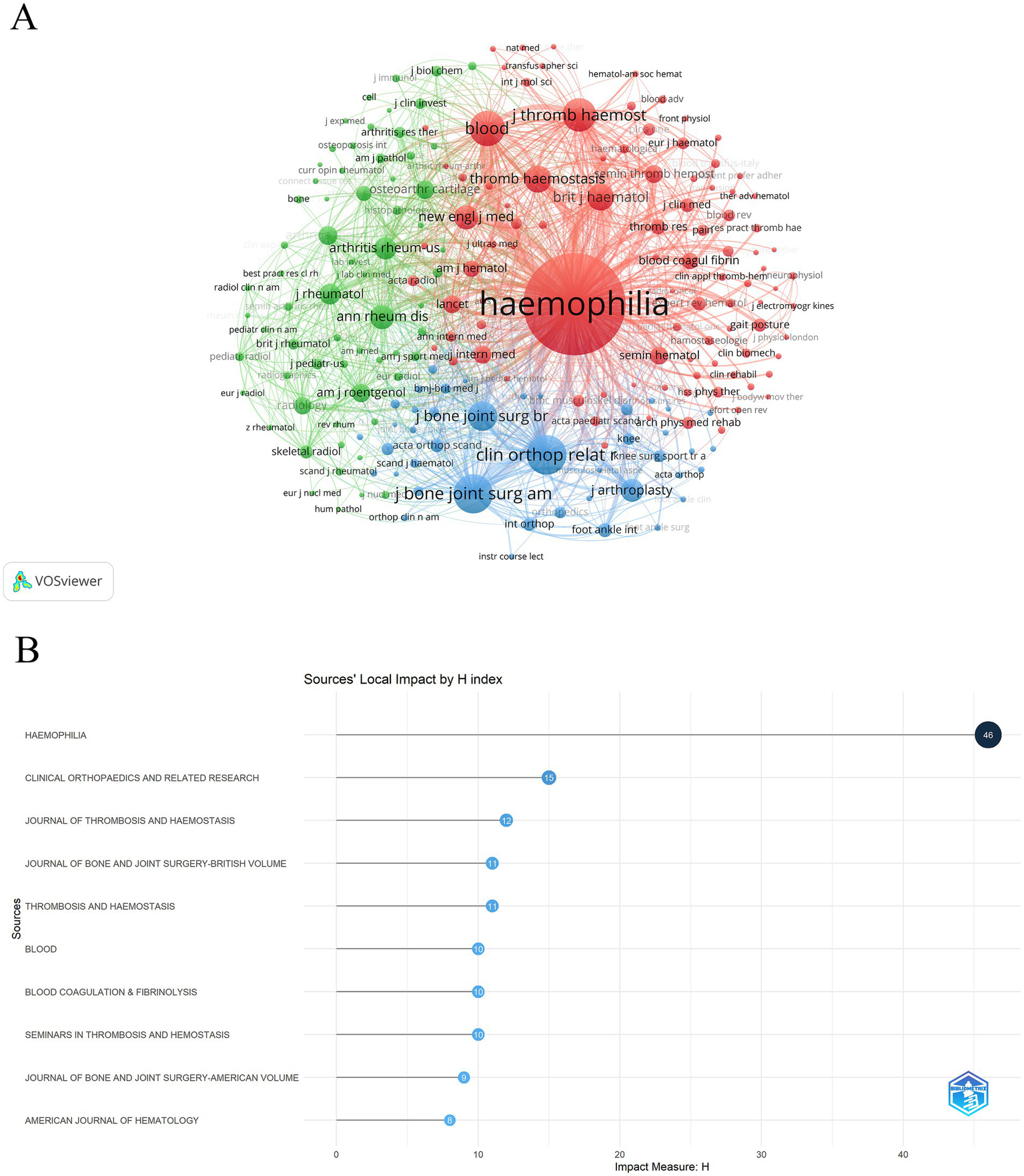 Based on co-citation frequency, these journals were divided into three categories, with their research directions tending toward similarity (Figure 6A). The red cluster focuses on hematology-related fields (HEMOPHILIA, BLOOD, JOURNAL OF THROMBOSIS AND HAEMOSTASIS, etc.); the green cluster centers on immunology (ANNALS OF THE RHEUMATIC DISEASES, ARTHRITIS AND RHEUMATOLOGY, etc.); and the blue cluster mainly indicates journals from the field of orthopedics (CLINICAL ORTHOPAEDICS AND RELATED RESEARCH, JOURNAL OF BONE AND JOINT SURGERY-AMERICAN VOLUME, etc.). Figure 6B shows the H-index of the 290 journals. The journal HEMOPHILIA, which has the highest number of published articles, is also ranked first based on the H-index, indicating the high impact value of the journal in the field of HA.