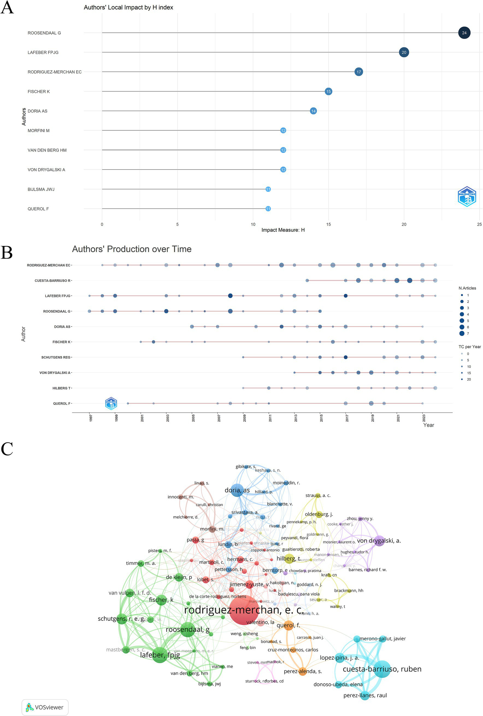 (A) Top 10 hemophilic arthropathy domain author H-index. (B) Annual number of publications and frequency of citations of high output authors. (C) Clustering network visualization for co-authorship analysis among authors.