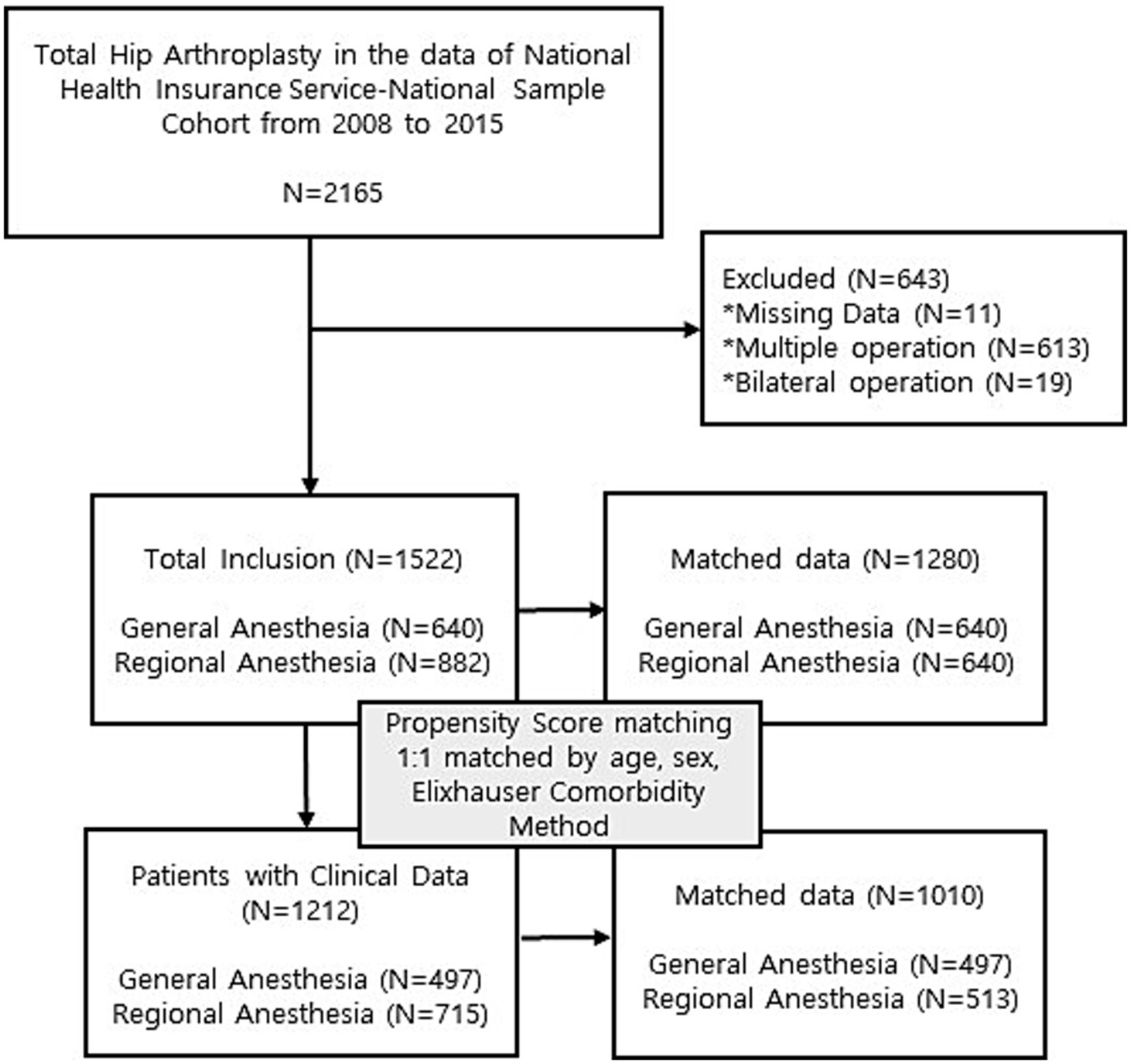 This retrospective study was reviewed and approved by the Institutional Review Board (IRB No. 2210-032-047), and the need for informed consent was waived because de-identified administrative data was used in this study. We analyzed data of patients who underwent THA between 2002 and 2015 obtained from the National Health Insurance Service-National Sample Cohort (NHIS-NSC). Patients were selected from the NHIS-NSC database using surgical codes for THA (N0711 and N2070) and anesthesia codes of GA (L1211, L1212, L0101, and L0103) and RA (L1213, L1214). The NHIS serves as the primary mandatory national healthcare institution, with approximately 97% of Korean citizens enrolled in the service. The NHIS-NSC database contains information from 1,025,340 randomly selected individuals, representing approximately 2.2% of the total Korean population (8).