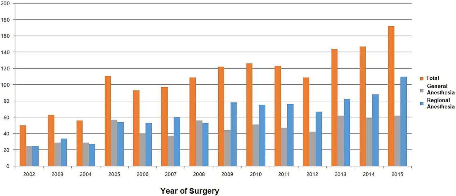 From 2002 to 2015, THA frequency steadily increased (Figure 2). In addition, analysis of changes in anesthesia methods over the years revealed a steady increase in the use of RA compared with the use of GA from 2002 to 2015 (Figure 2).
