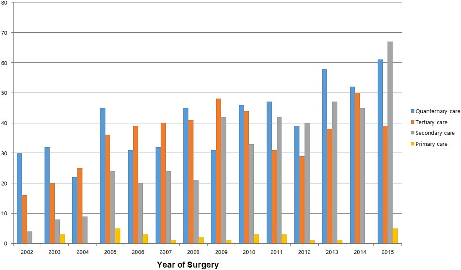 There was a notable shift in the types of hospitals performing THA. Between 2002 and 2008, most surgeries were performed in quaternary and tertiary care facilities. However, over time, the number of surgeries conducted in secondary care facilities increased (Figure 3).